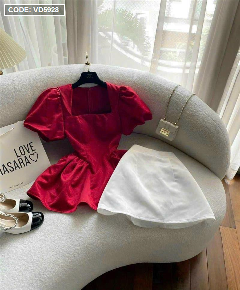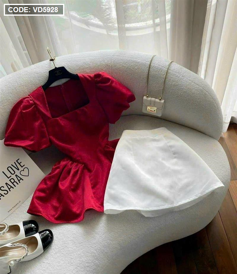 Sét áo peplum đỏ cổ vuông tay phồng + chân váy trắng