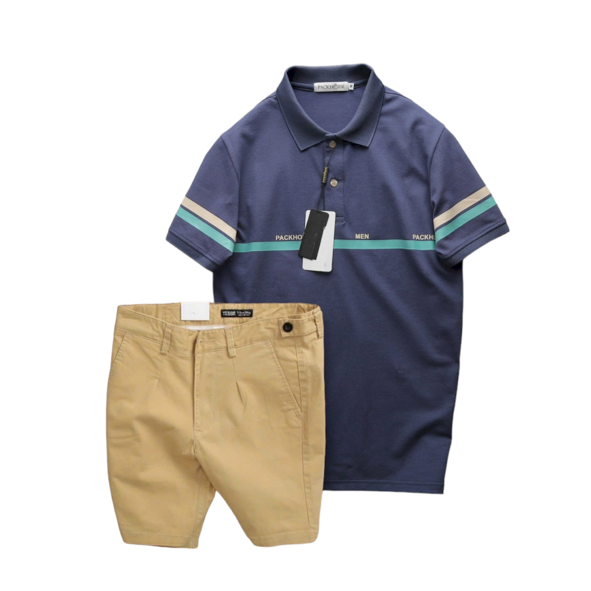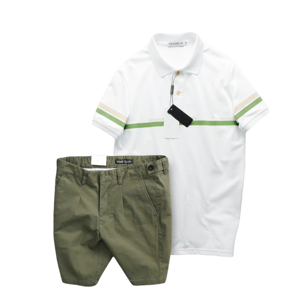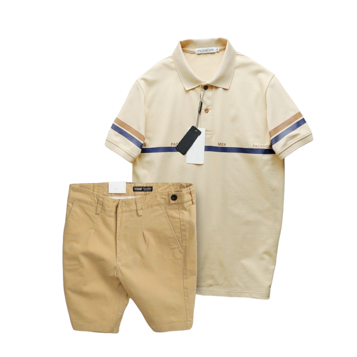 Set Bộ Nam Áo Polo Cổ Bẻ Viền Hai Sọc Quần Short Kaki Cúc Đen