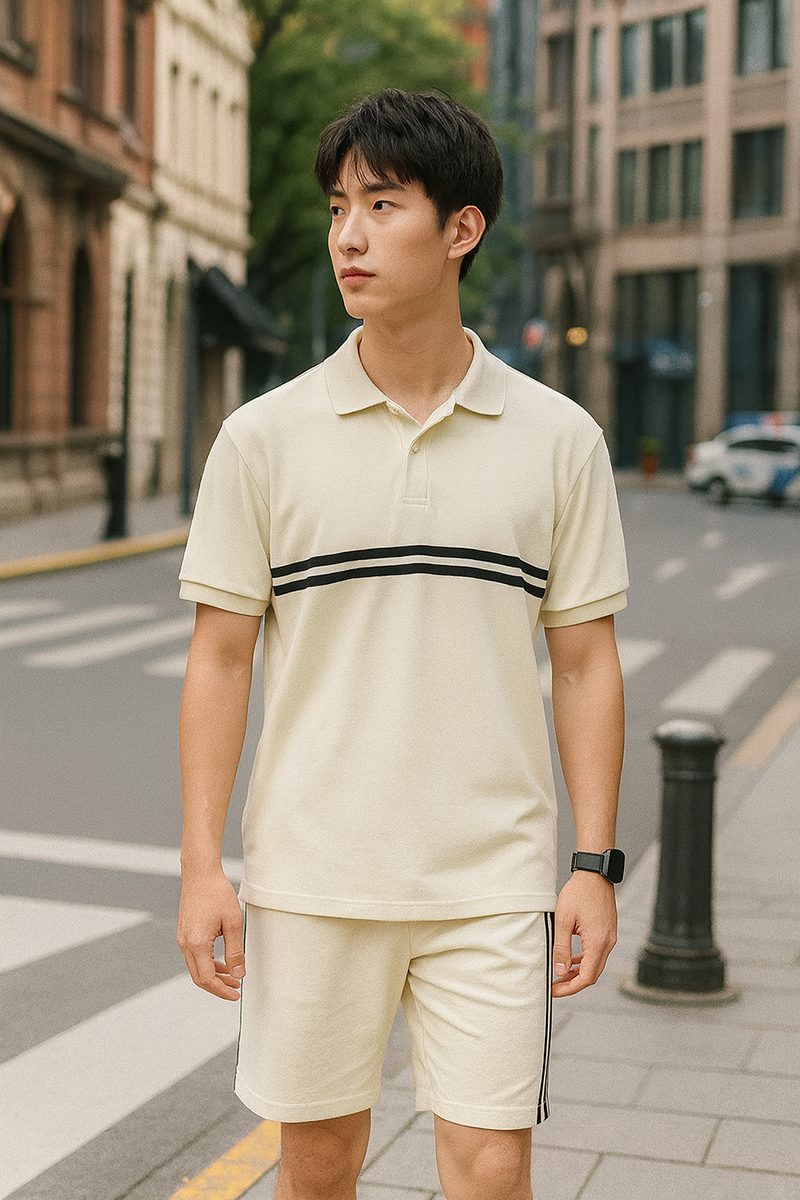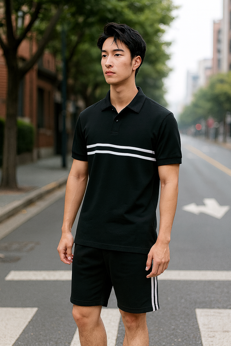 Set Bộ Nam Áo Thun Cổ Bẻ Phối Sọc Trước Ngực + Quần Short Thun (Big Size)