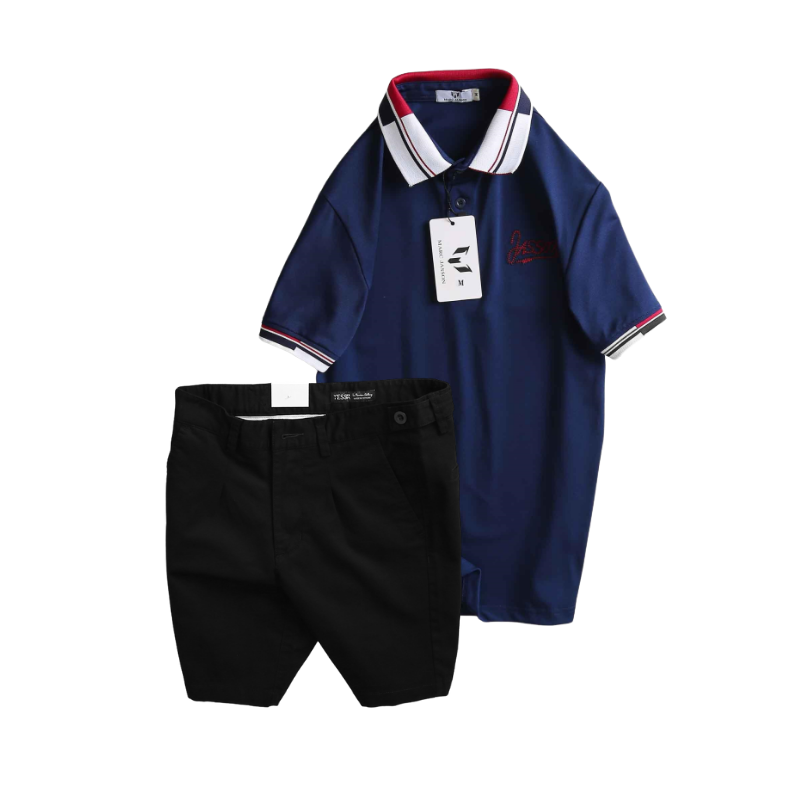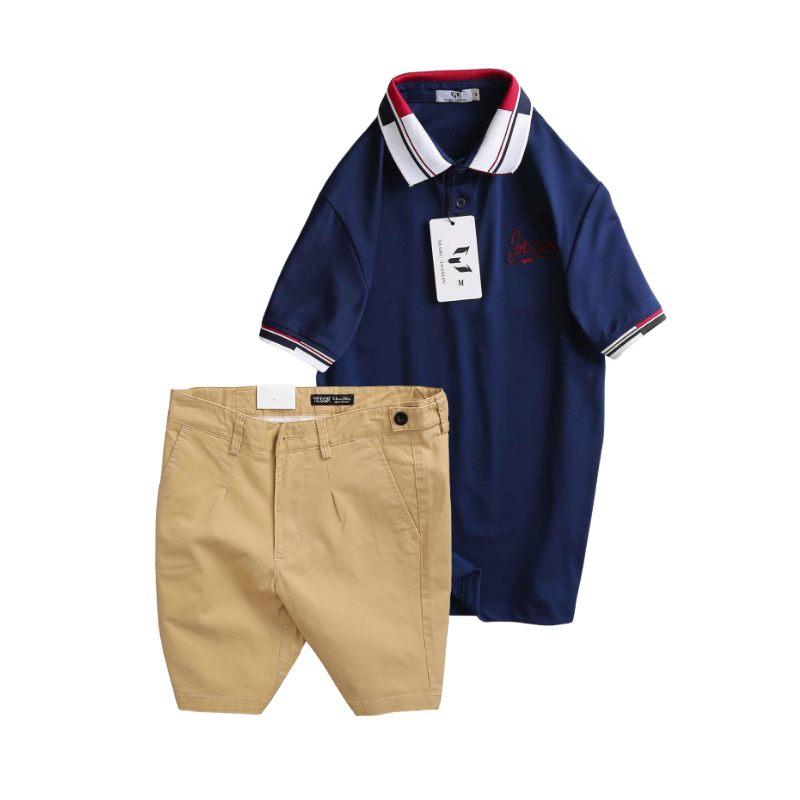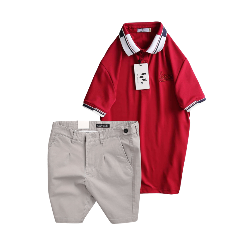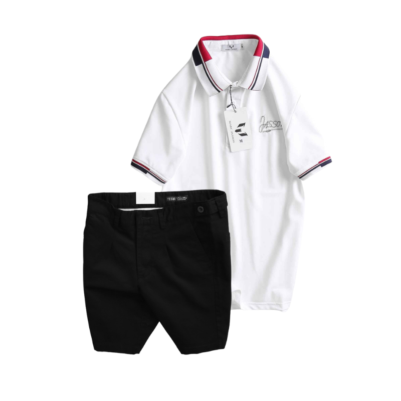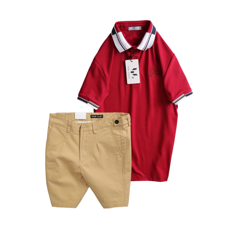 Set Bộ Nam – Áo Thun Nam Polo Cổ Bẻ Phối Sọc Thêu Logo Chữ Trước Ngực Bền Đẹp Và Quần Short Kaki Co Giãn Phối Nút Cao Cấp (Có Size 36)