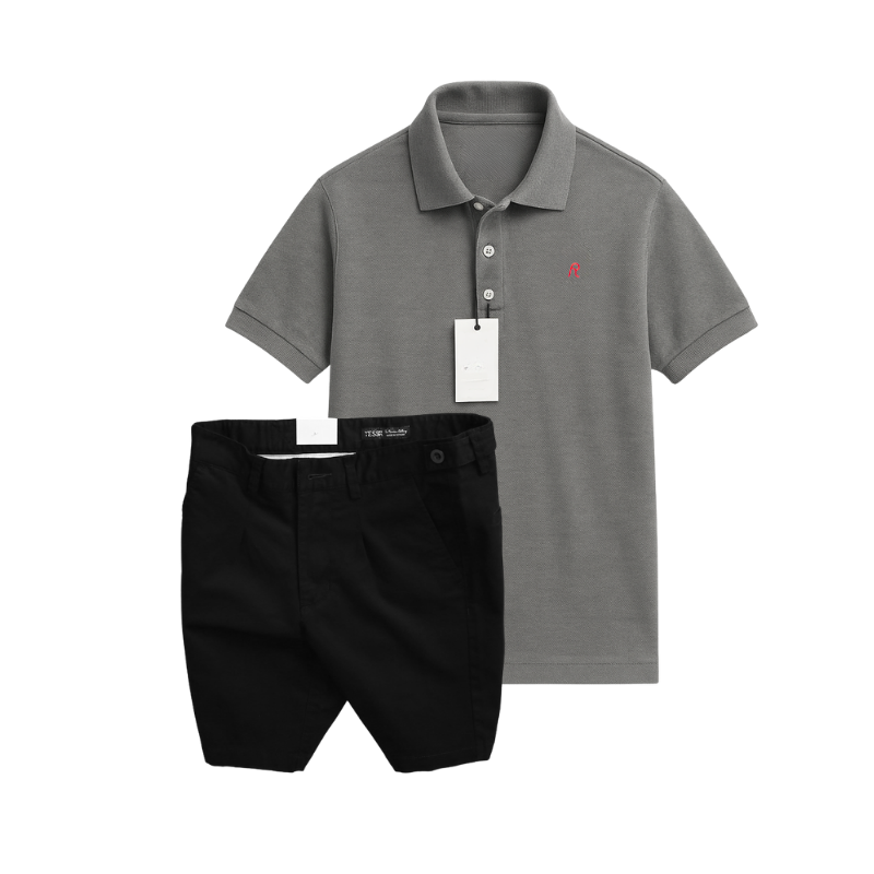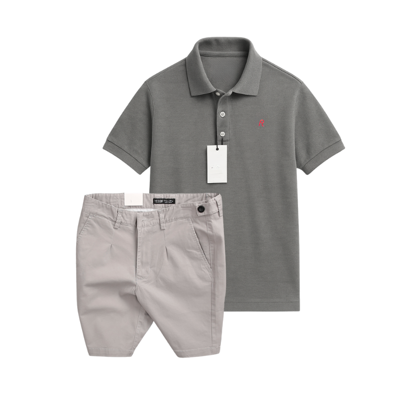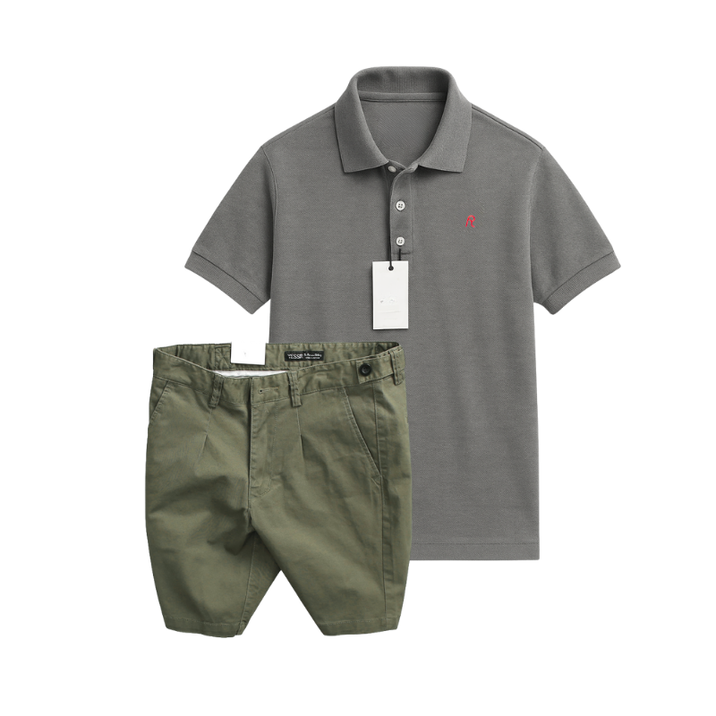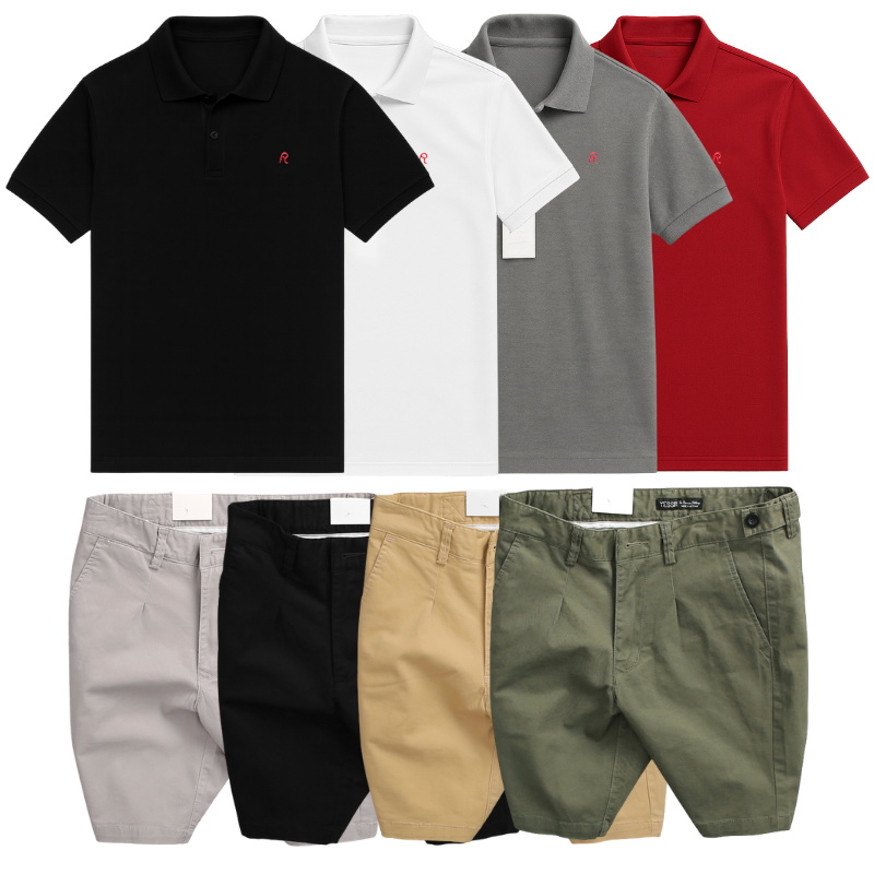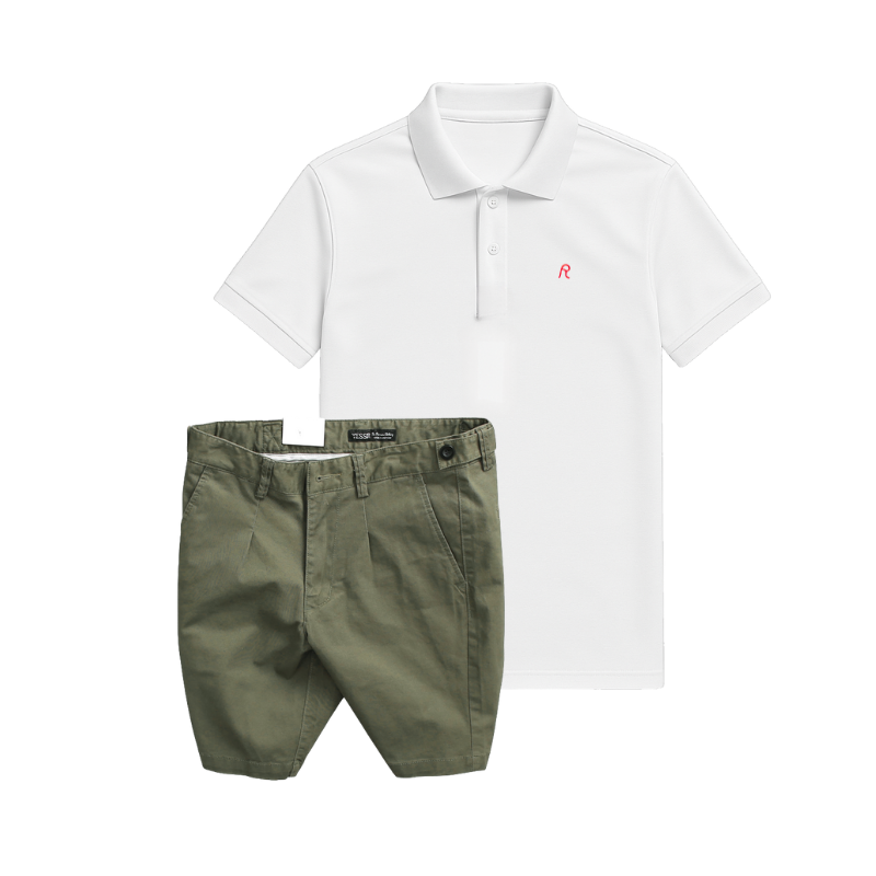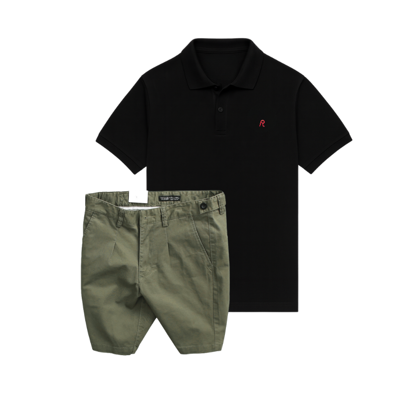 Set Bộ Nam – Áo Thun Nam Polo Cổ Bẻ Thêu Logo Chữ R Trước Ngực Và Quần Short Kaki Co Giãn Phối Nút Cao Cấp (Có Size 36)