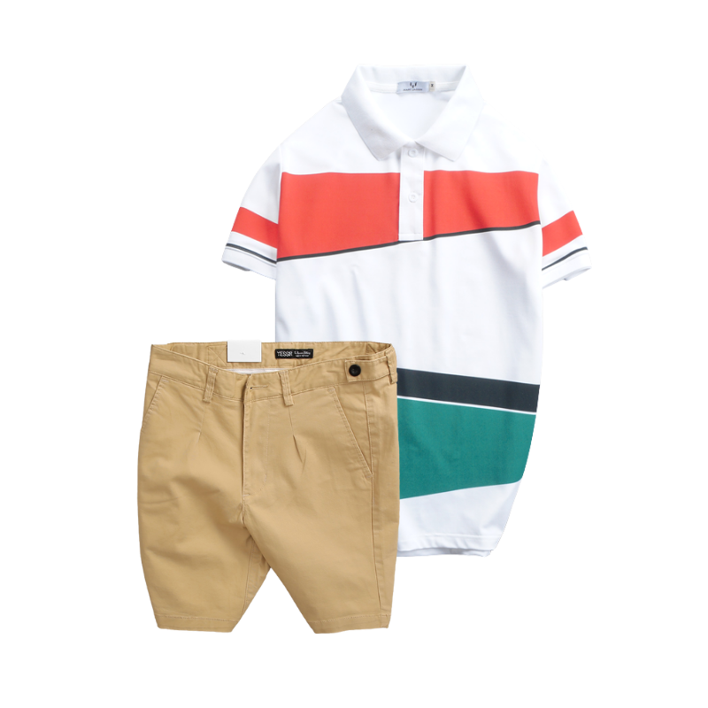 Set Bộ Nam – Áo Thun Nam Polo Cổ Bẻ Vải Thun Cá Sấu Poly Phối Kẻ Sọc Màu Và Quần Short Kaki Co Giãn Phối Nút Cao Cấp (Có Size 36)