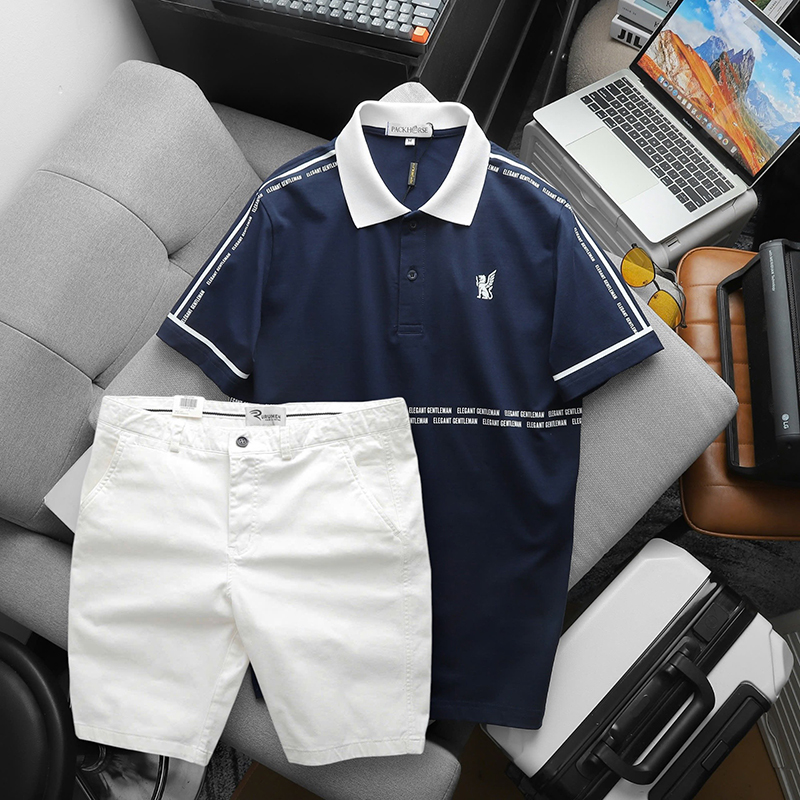 Set bộ nam gồm áo thun cổ bẻ in logo trước ngực và quần short kaki cao cấp phù hợp cho các hoạt động thường ngày hay dạo phố