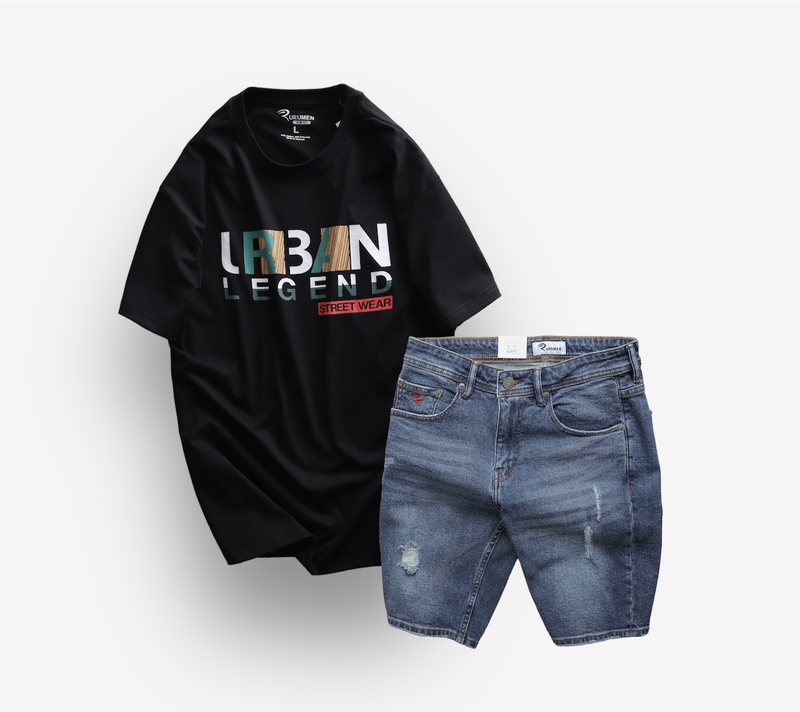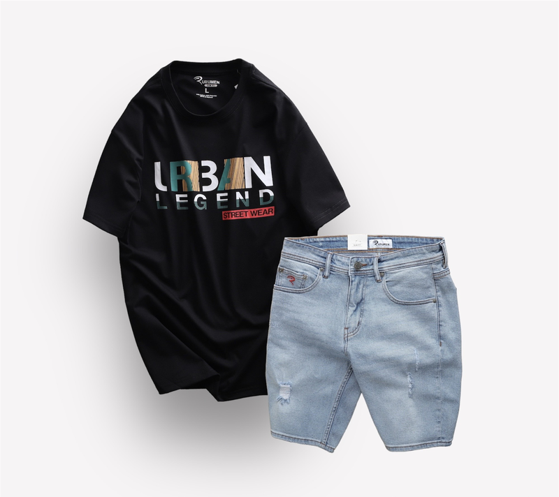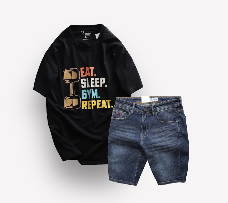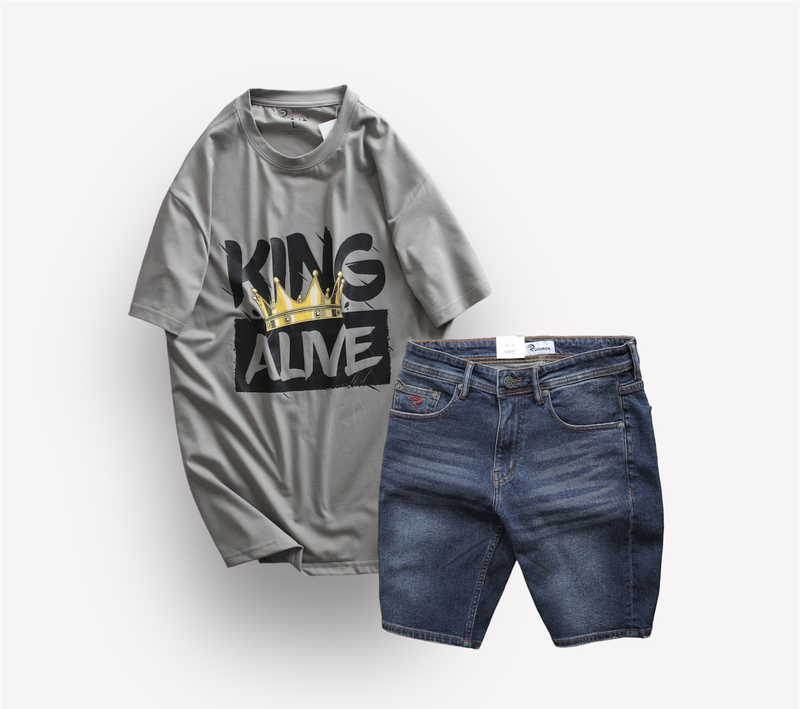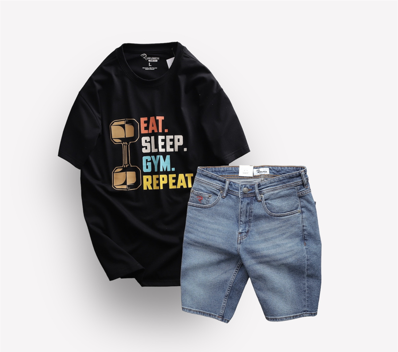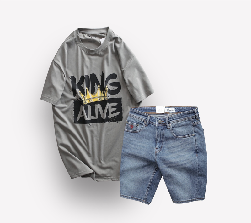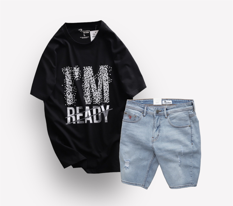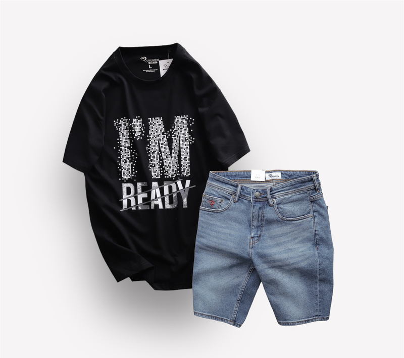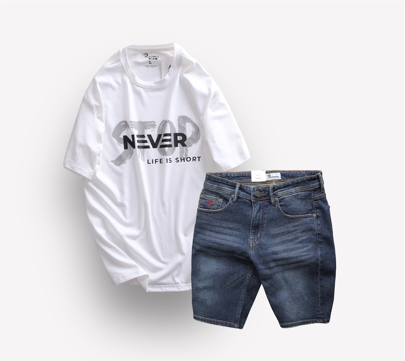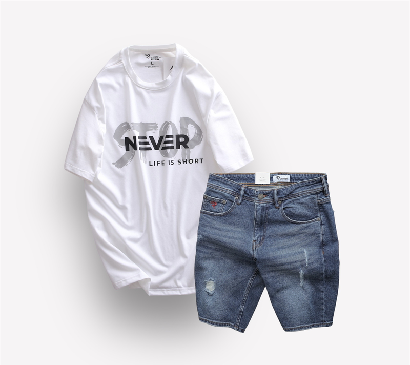 Set Bộ Nam Quần Short Jeans Phối Áo Thun Cổ Tròn In Chữ Big size