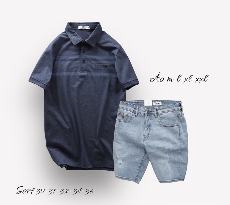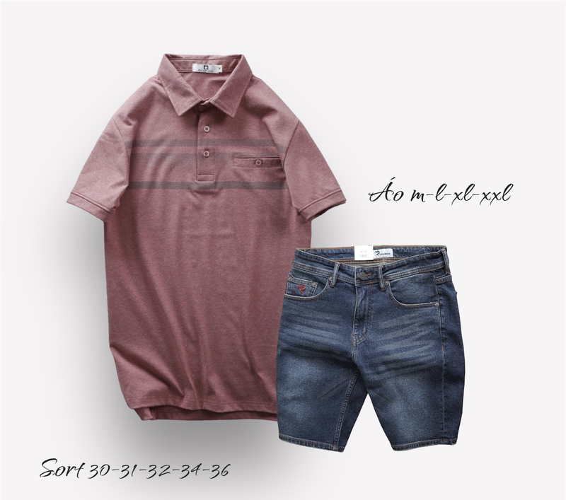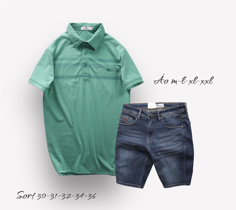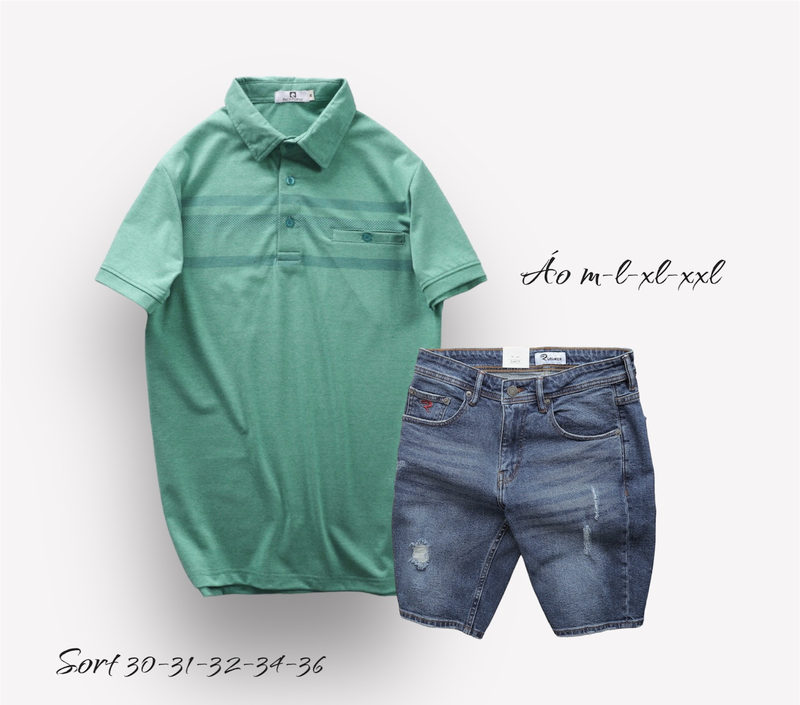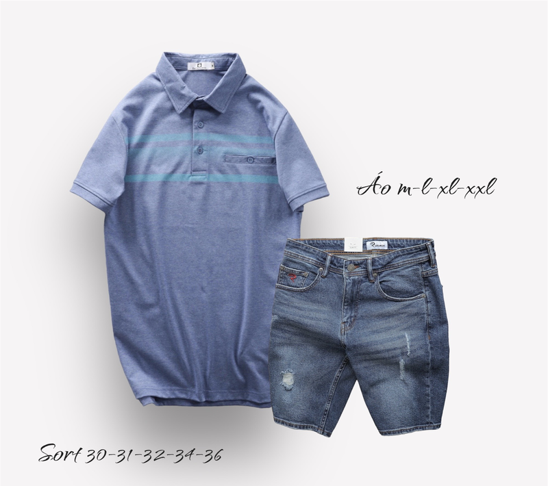 Set Bộ Nam Quần Short Jeans Phối Áo Thun Cotton Tay Ngắn Cổ Bẻ Có Túi