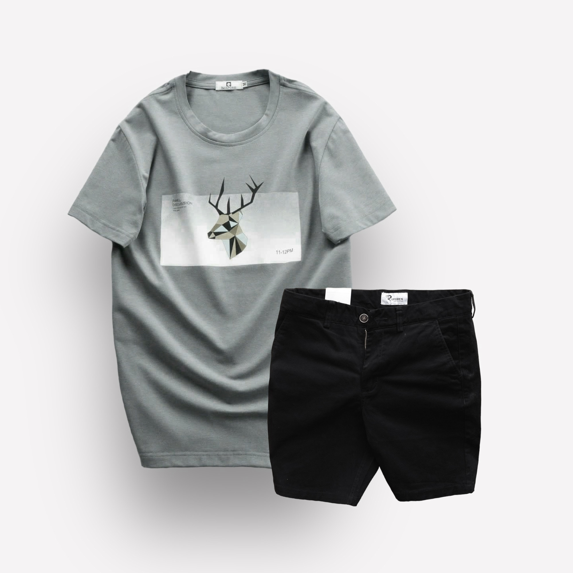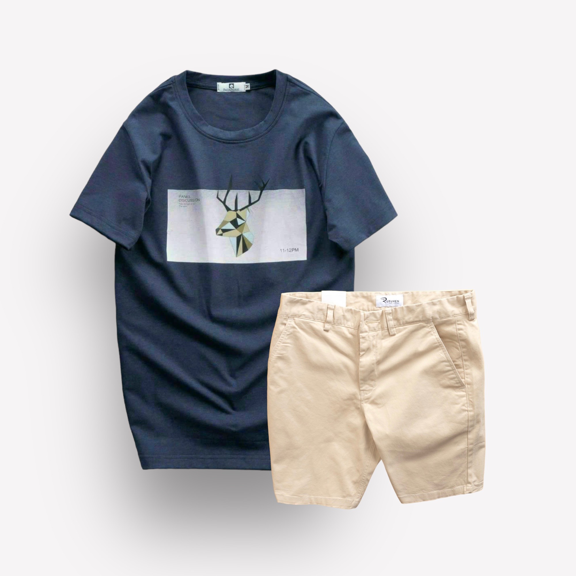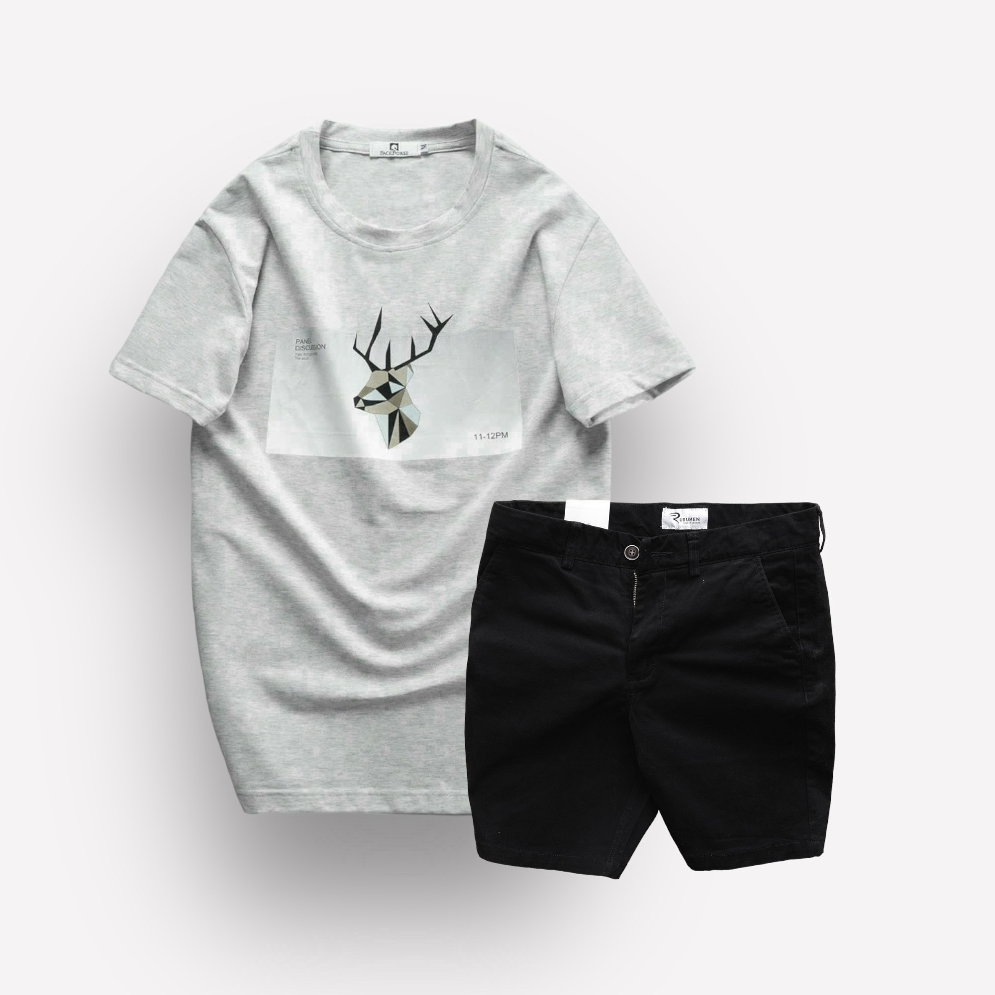 Set Bộ Nam Quần Short Kaki Rurumen Phối Áo Thun Cổ Tròn In Hình Tuần Lộc