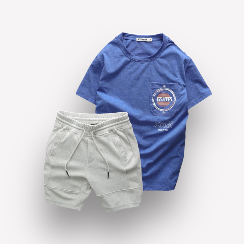 Set Bộ Nam Quần Short Thun Áo Thun Cổ Tròn Phối Túi In Hình