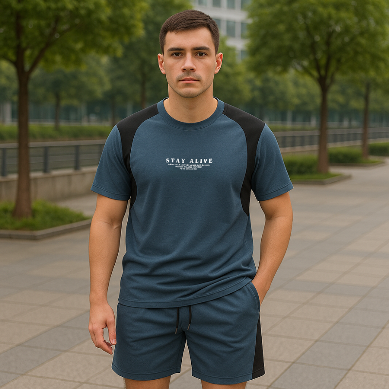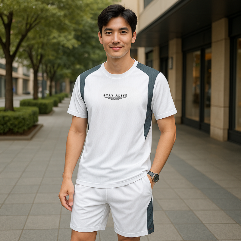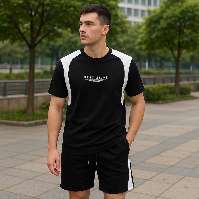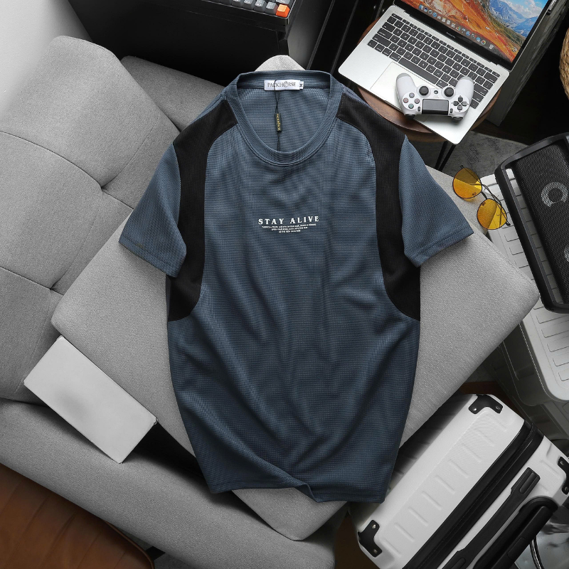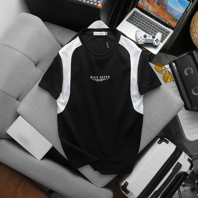 ✔ Áo cổ tròn tay ngắn, in chữ “STAY ALIVE” nổi bật ở ngực – vibe vừa chất vừa cổ vũ tinh thần.