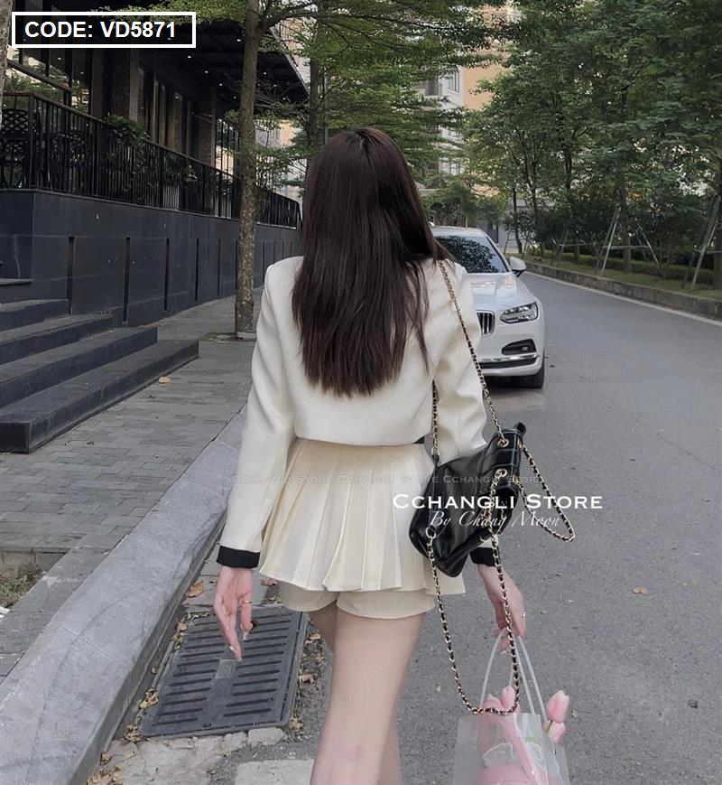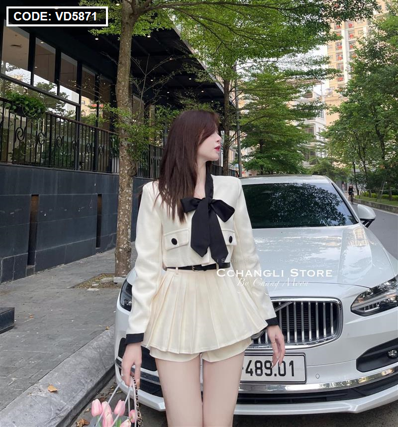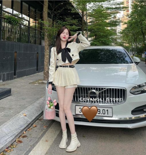 Sét crop dạ túi nắp viền thắt nơ cổ + chân váy xếp ly kèm nịt