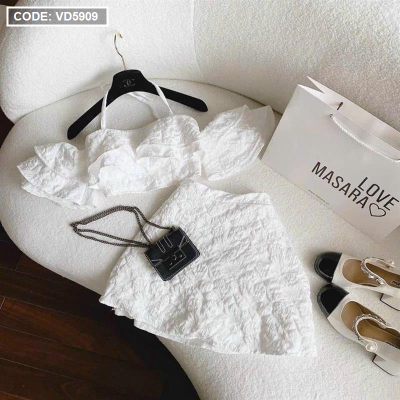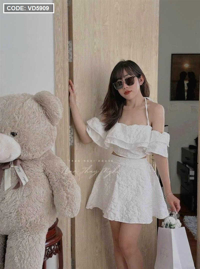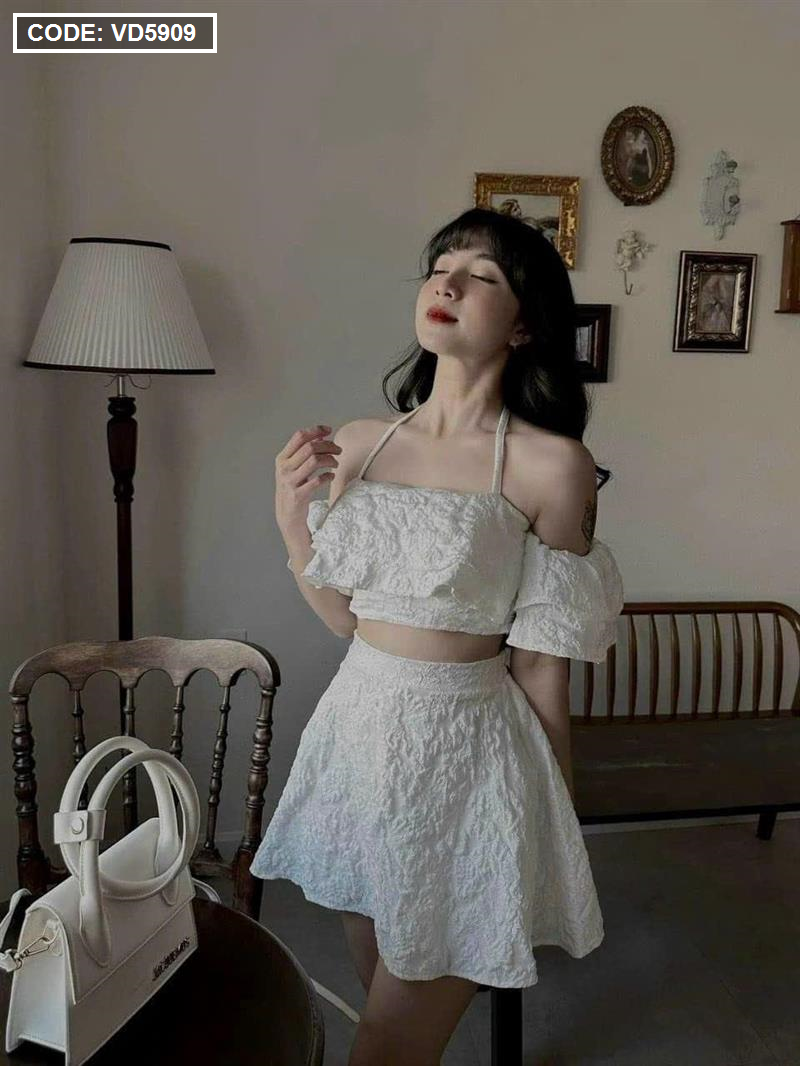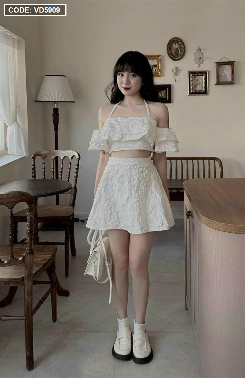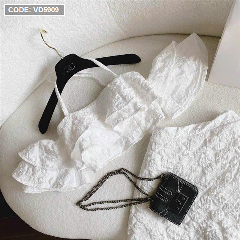 Sét gấm nổi crop trắng cổ yếm tầng bèo + chân váy