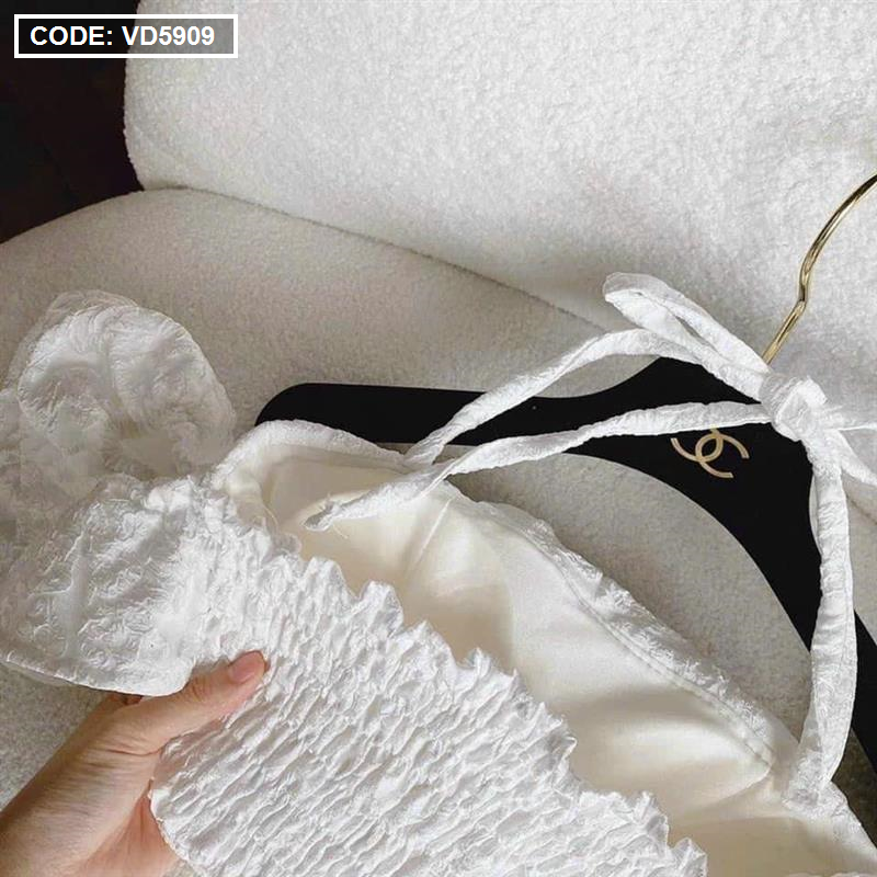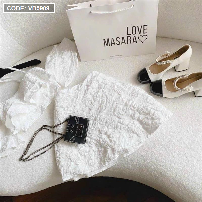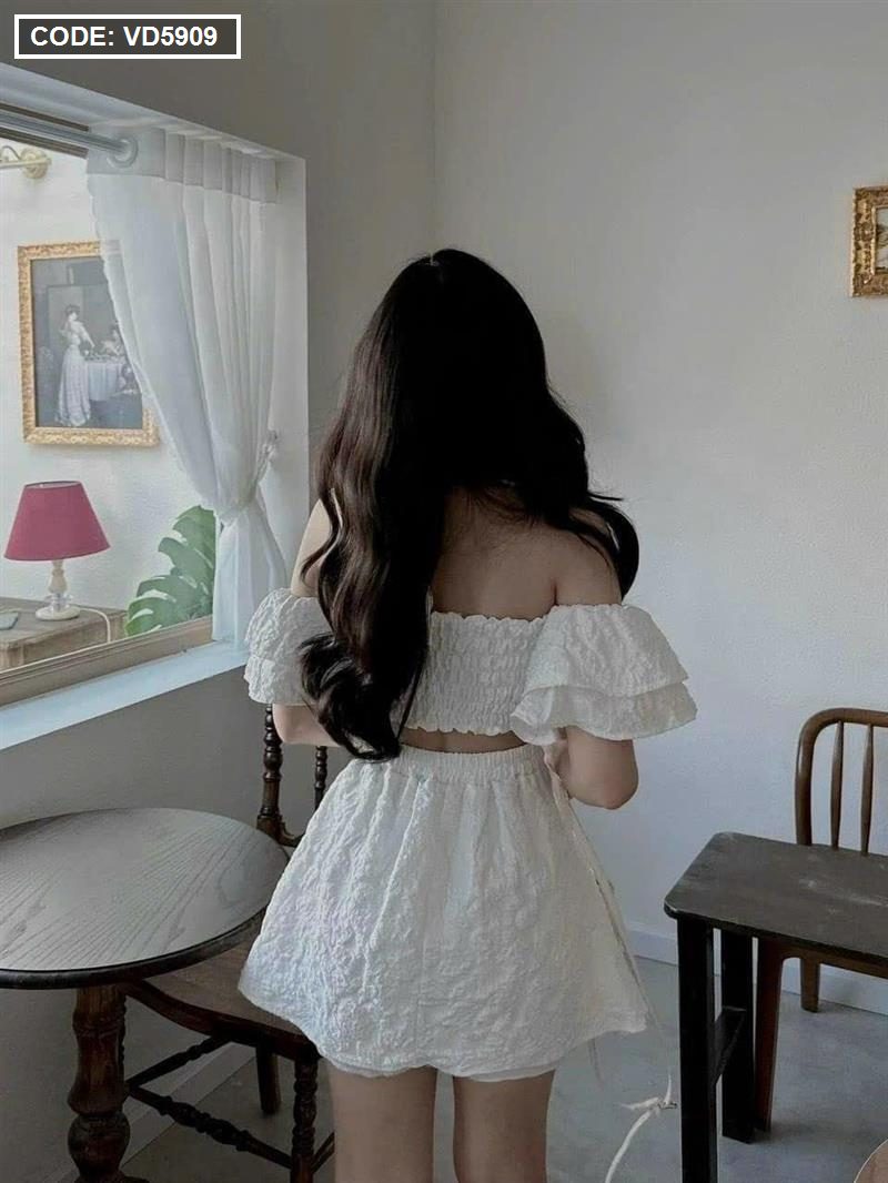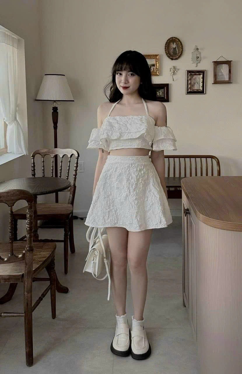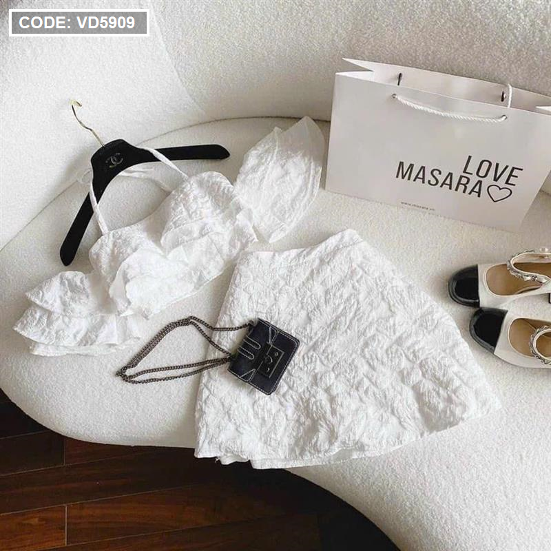 Sét gấm nổi crop trắng cổ yếm tầng bèo + chân váy
