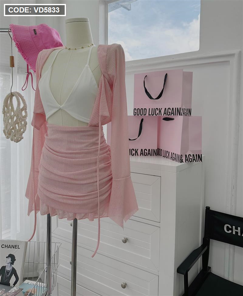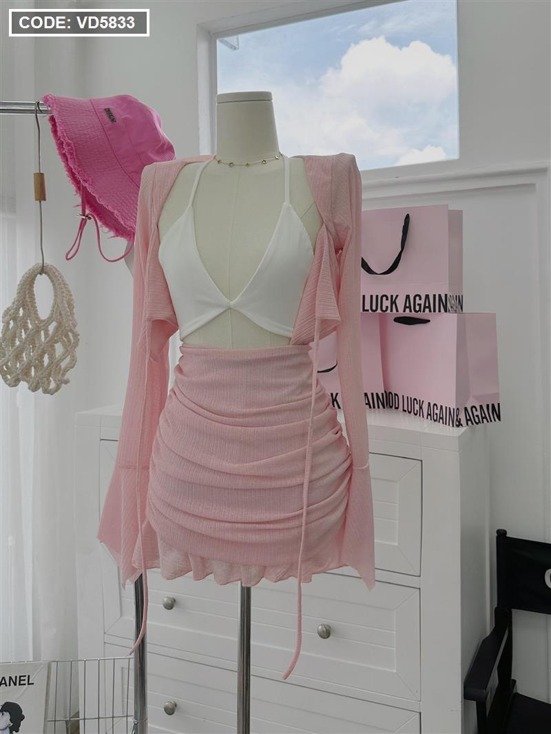 Sét khoác hồng + bra 2 dây trắng + chân váy xếp ly