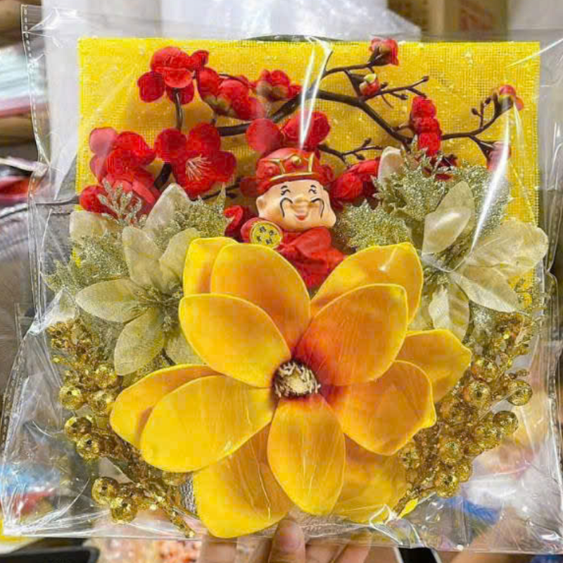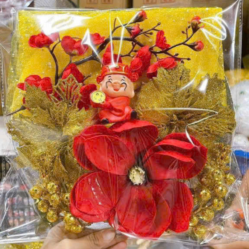 - Tượng Thần Tài / Mèo Thần Tài may mắn – đặt giữa bố cục, mang ý nghĩa tài lộc cho năm mới.
