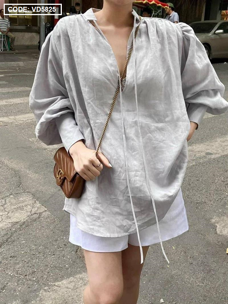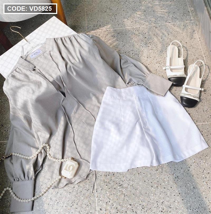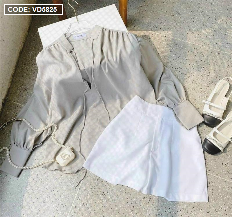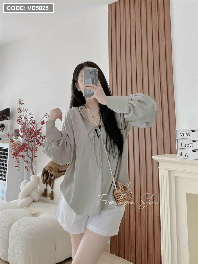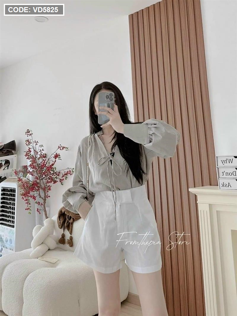 Sét sơ mi cổ v xám tay phồng short