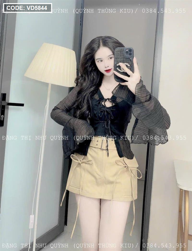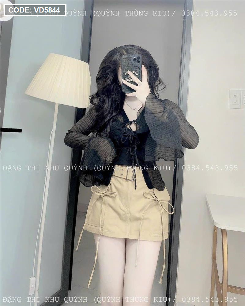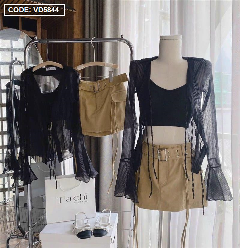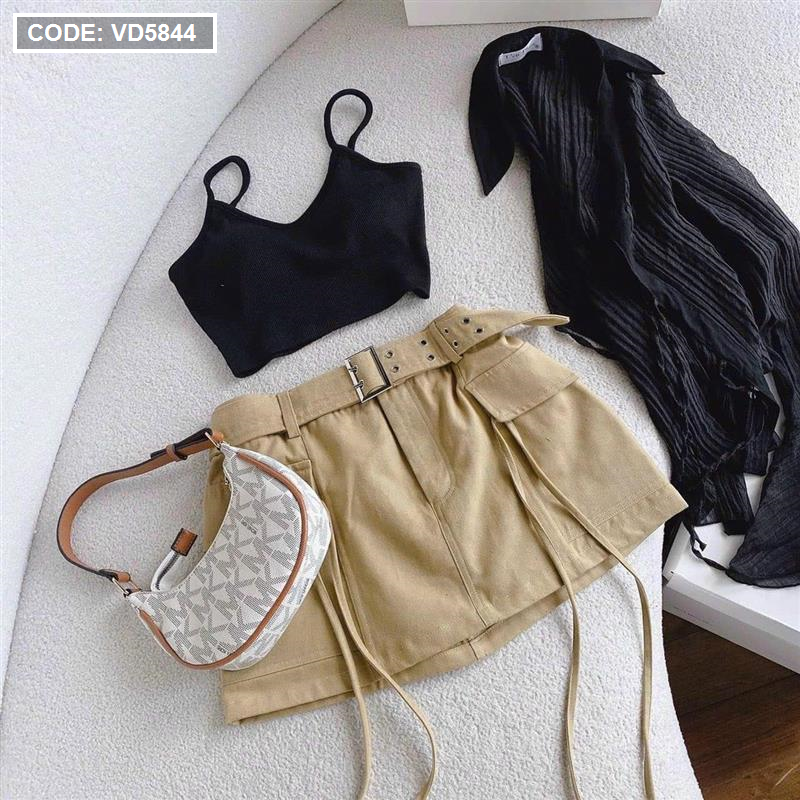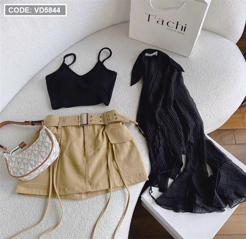 Sét sơ mi đen đen sọc + bra 2 dây + chân váy kaki nâu kèm belt