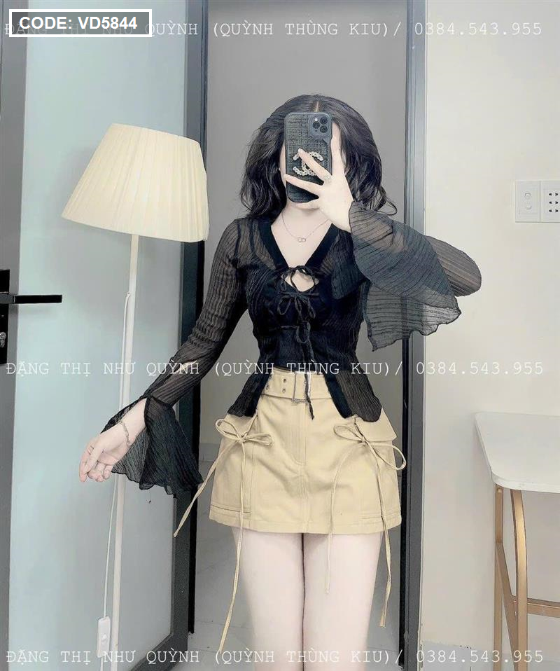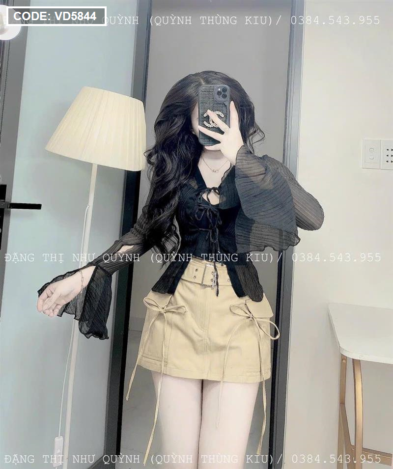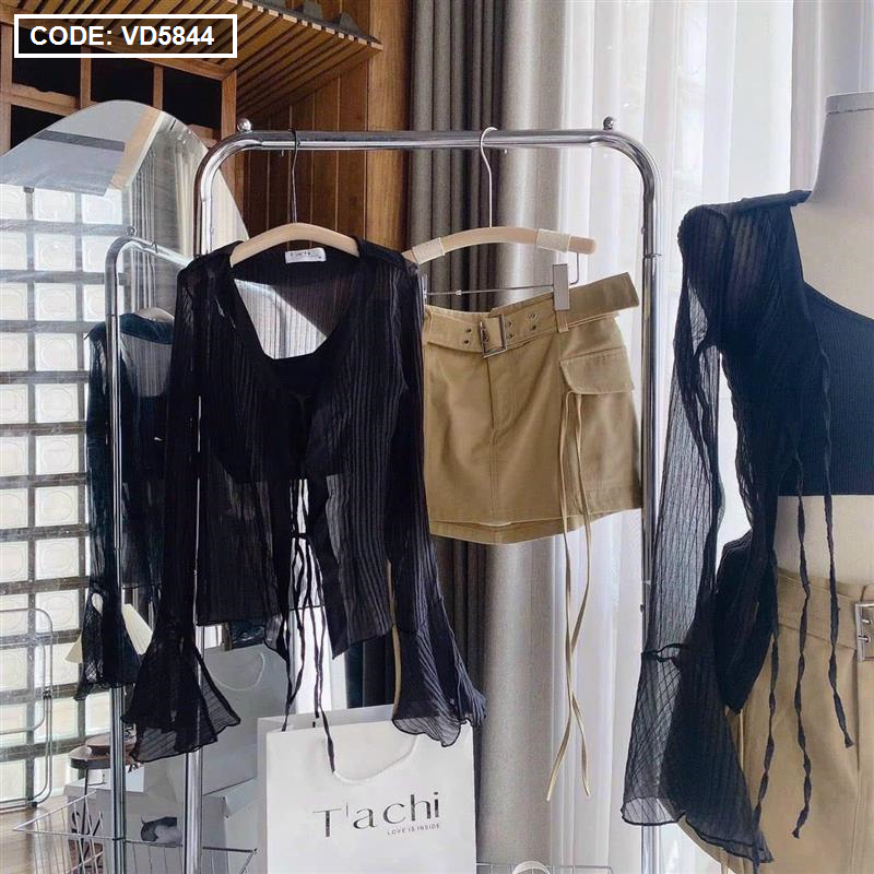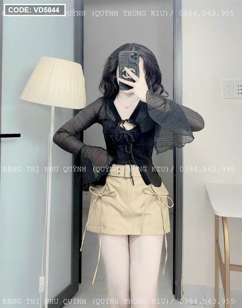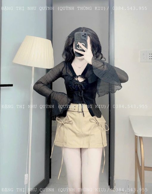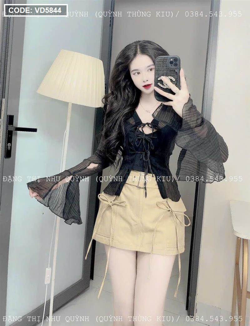 Sét sơ mi đen đen sọc + bra 2 dây + chân váy kaki nâu kèm belt