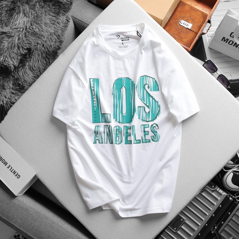 Áo Thun Nam Cổ Tròn Rurumen Màu Trắng In Chứ Los Angeles Big Size