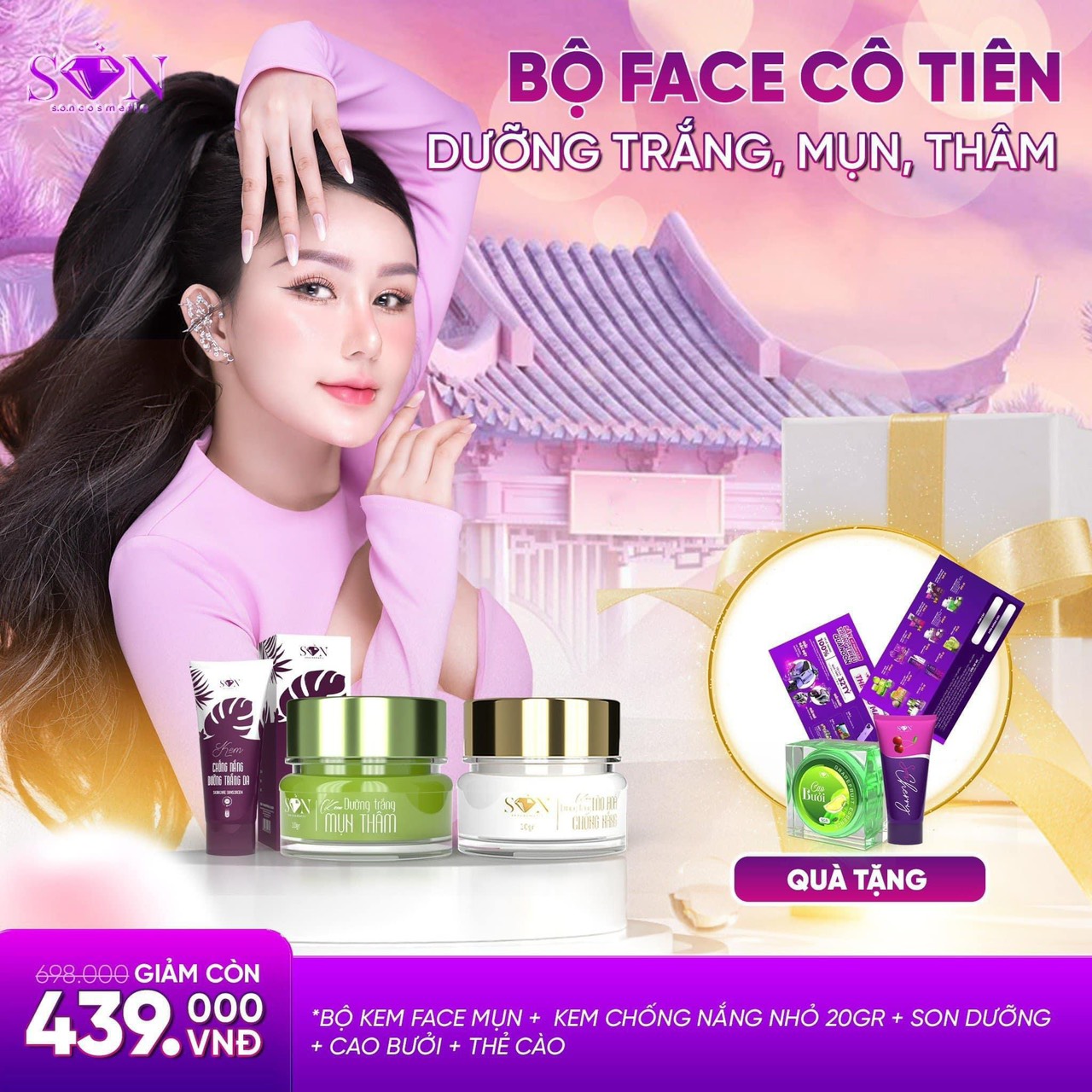 Bộ Face Cô Tiên Dưỡng Trắng Mụn Thâm SON Cosmetic bao gồm : 1 face trắng + 1 face mụn thâm + kem chống nắng lớn Tặng kèm 1 cao bưởi + 1 son dưỡng + 1 thẻ cào