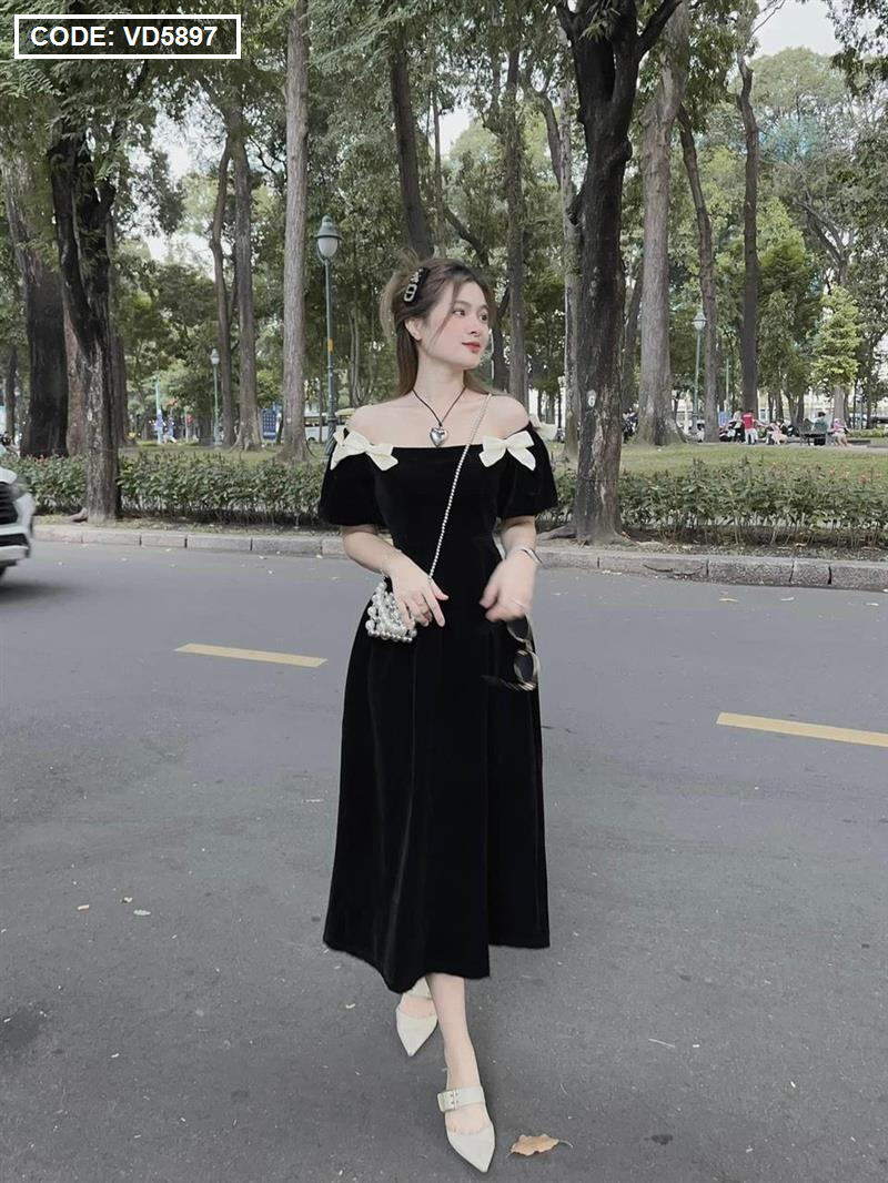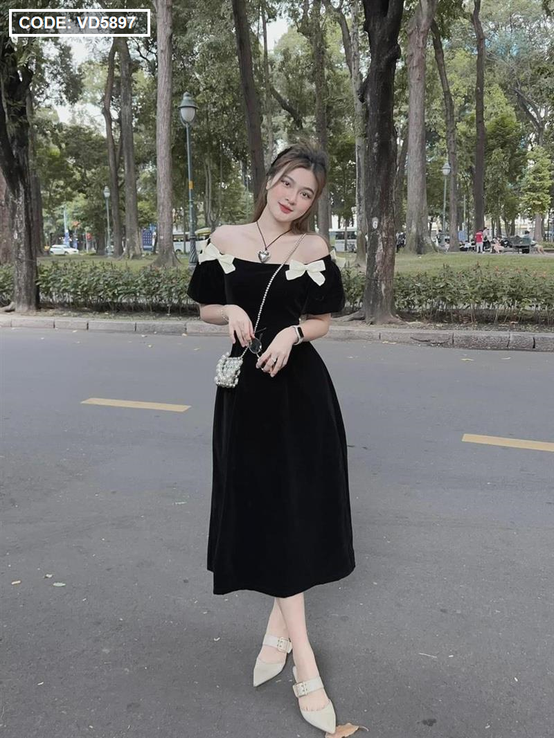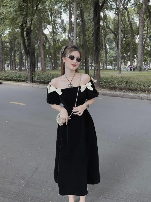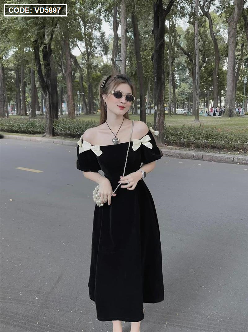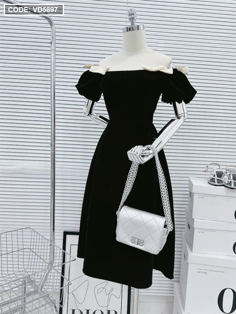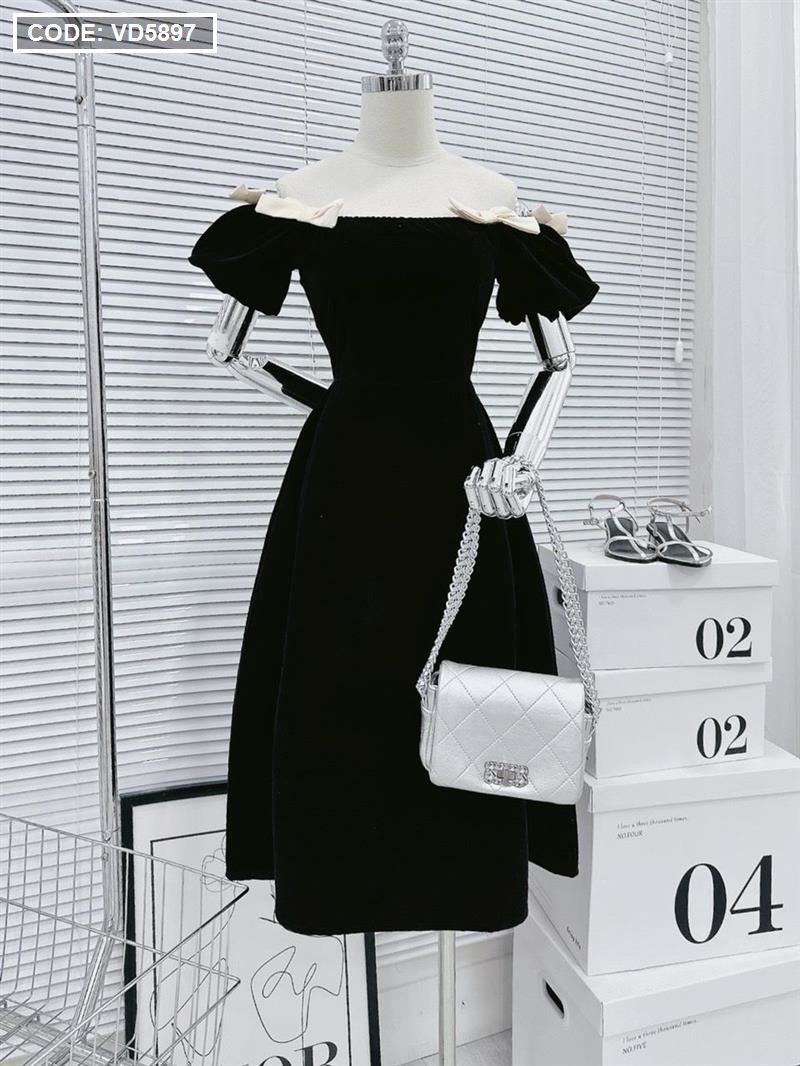 Shop sỉ đầm nhung bẹt vai đính nơ kem