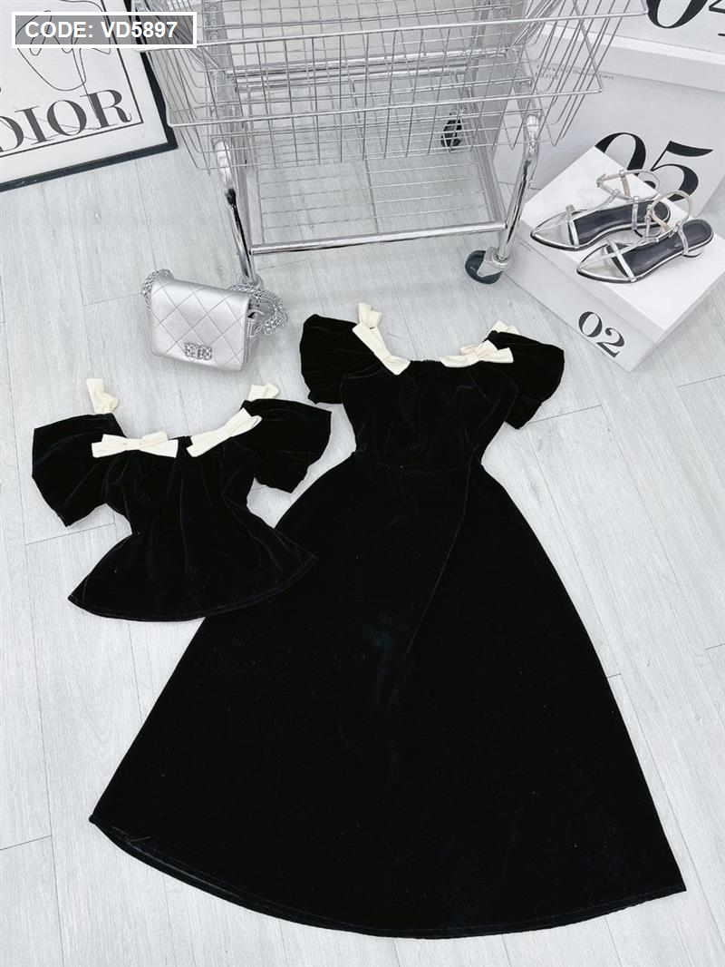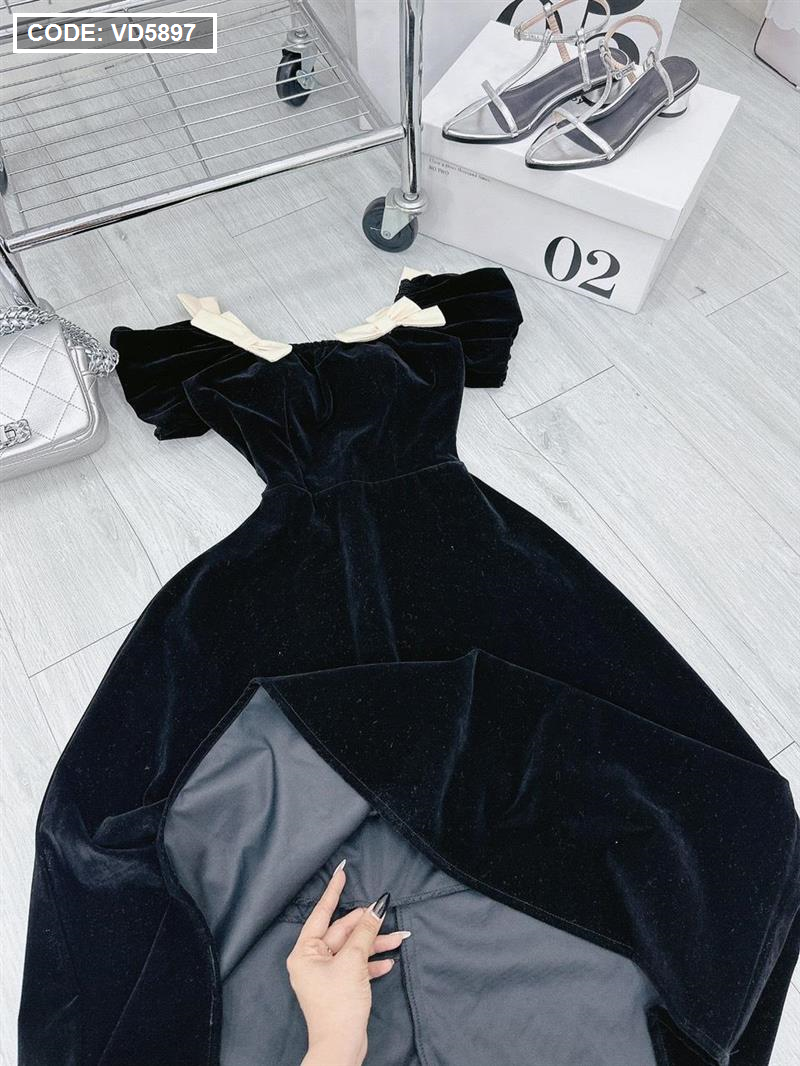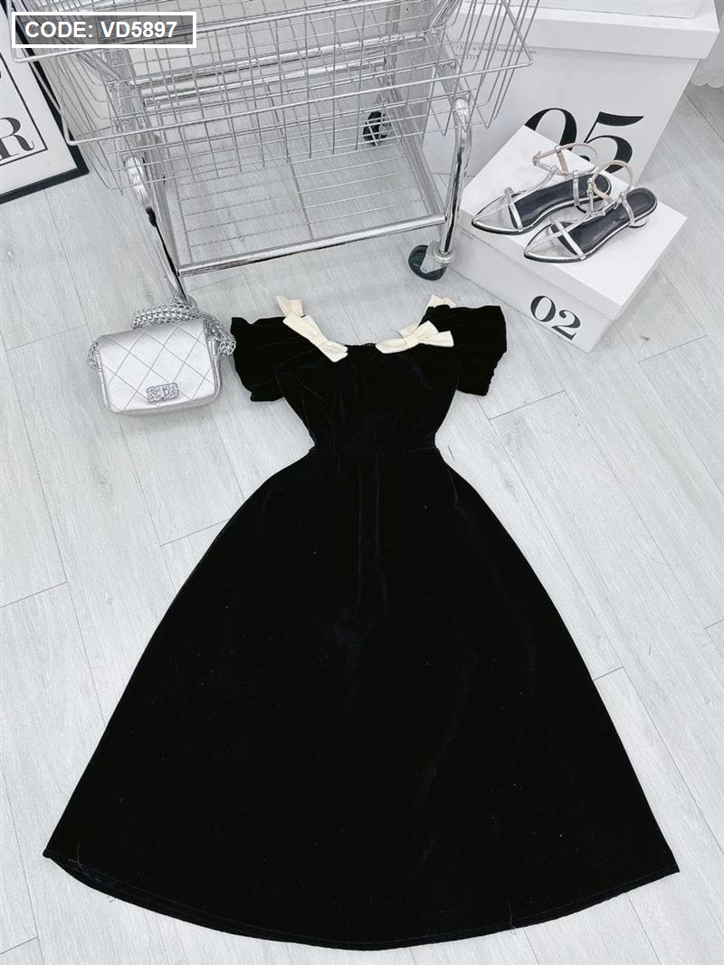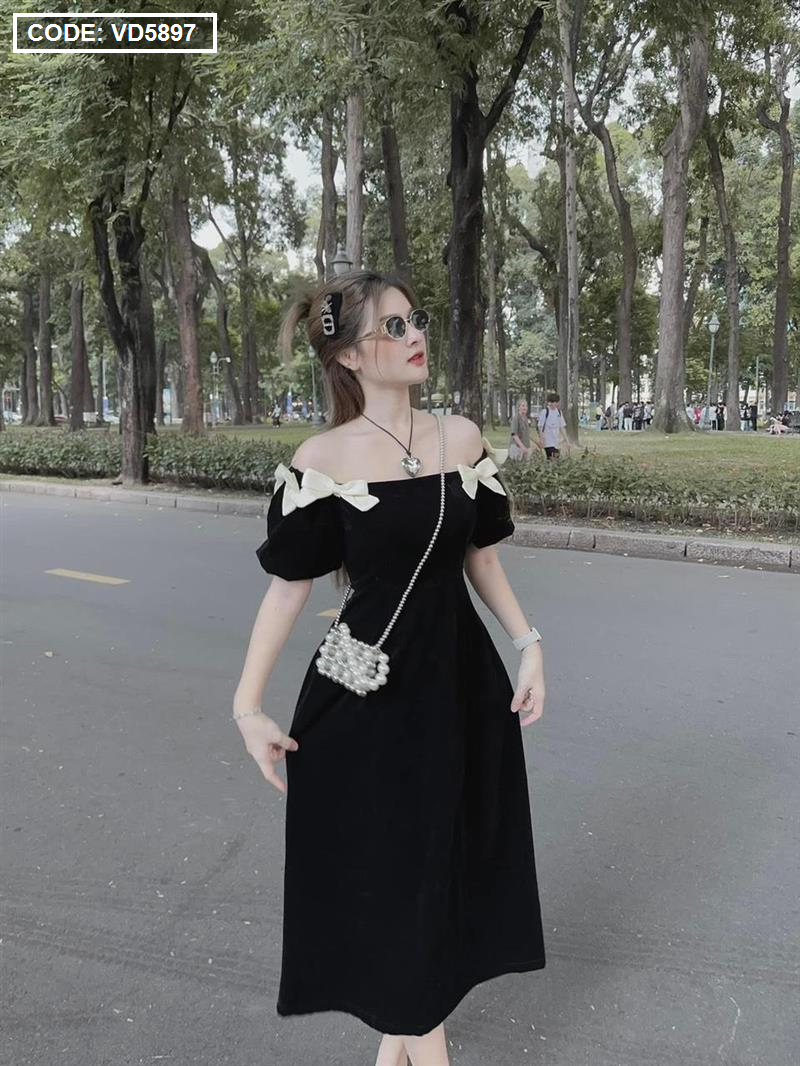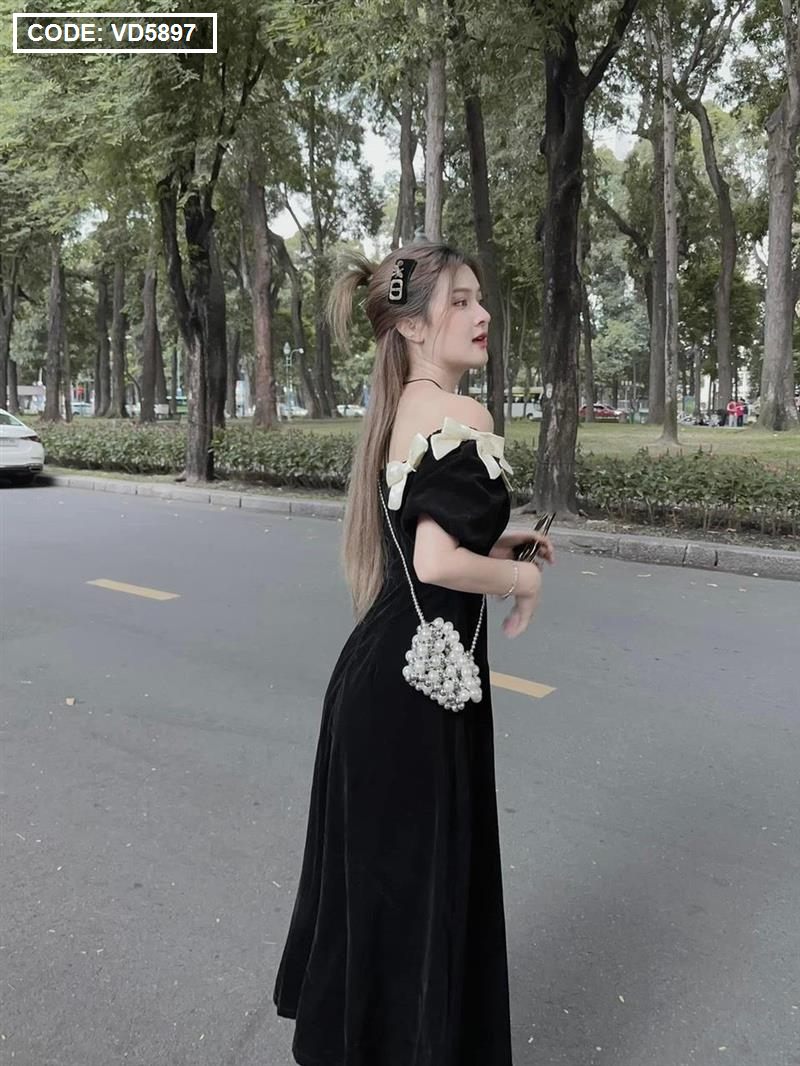 Shop sỉ đầm nhung bẹt vai đính nơ kem