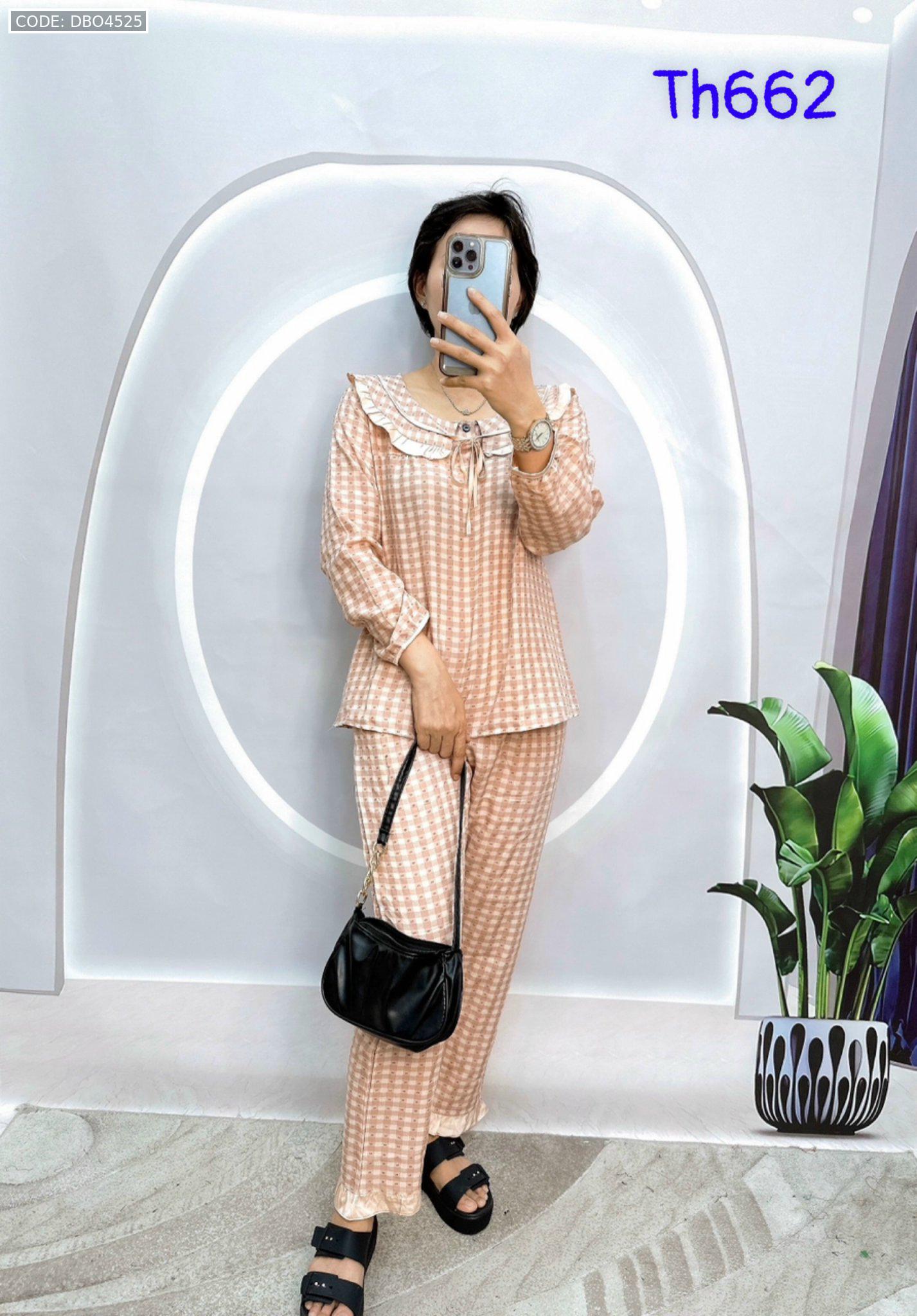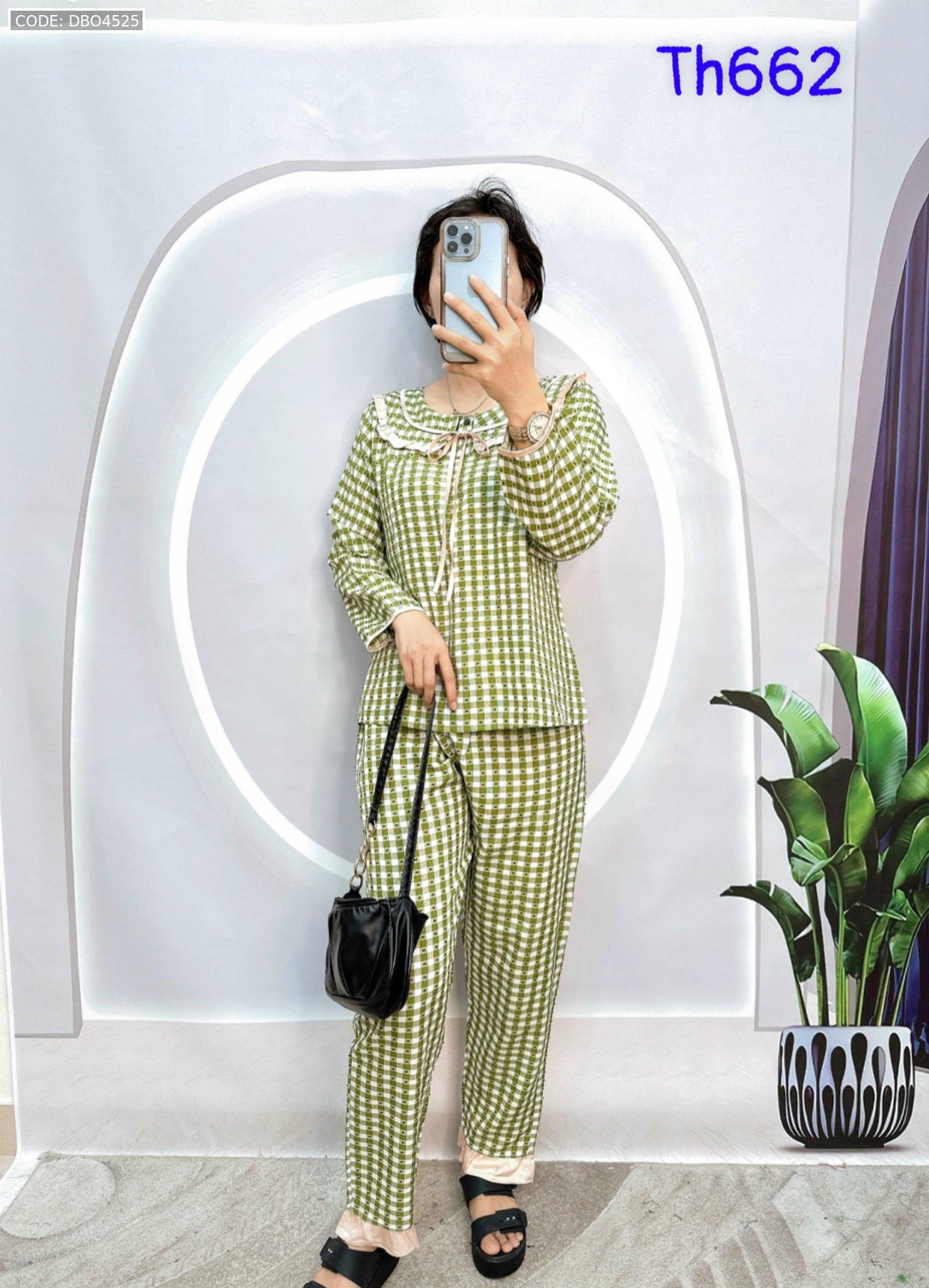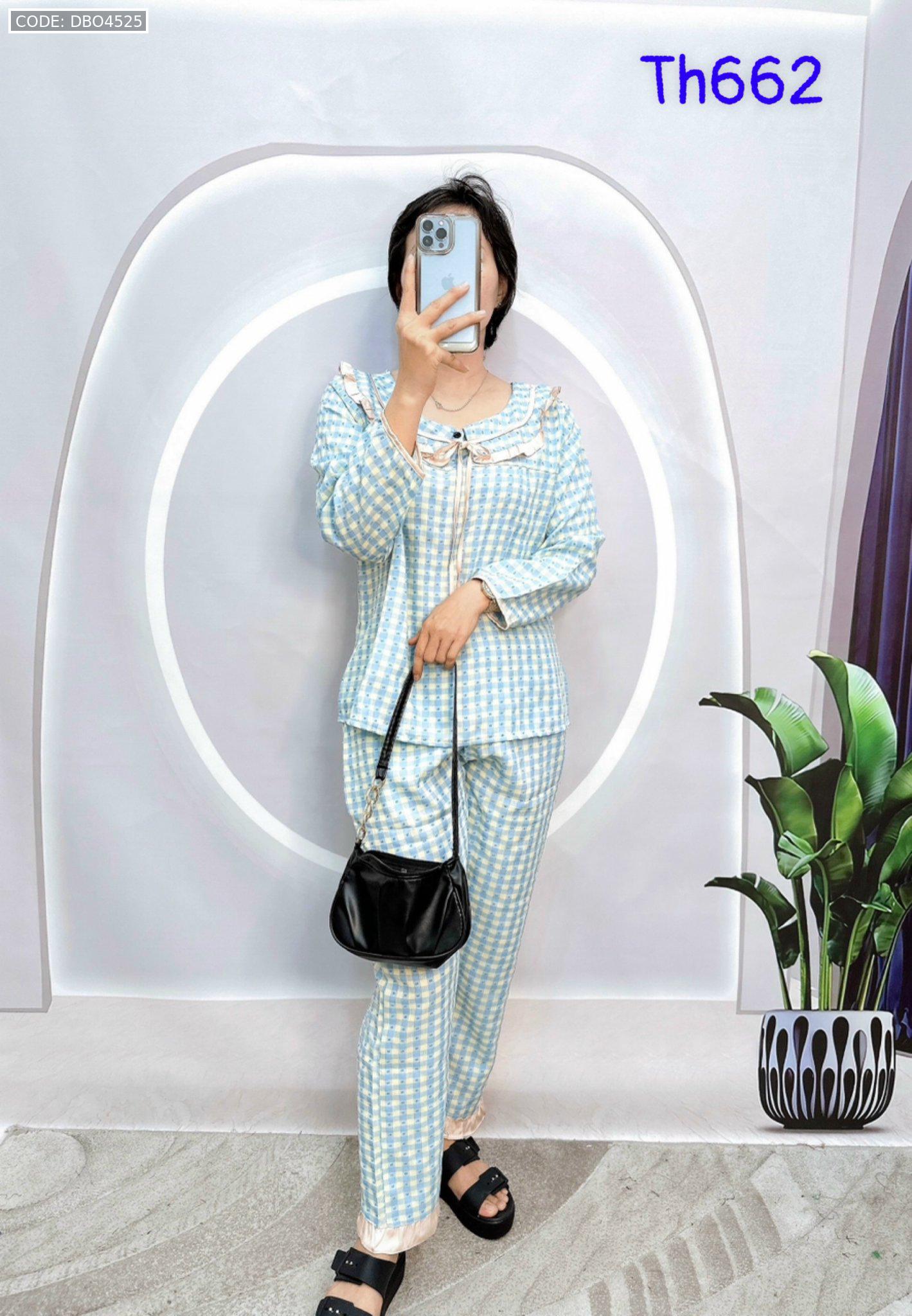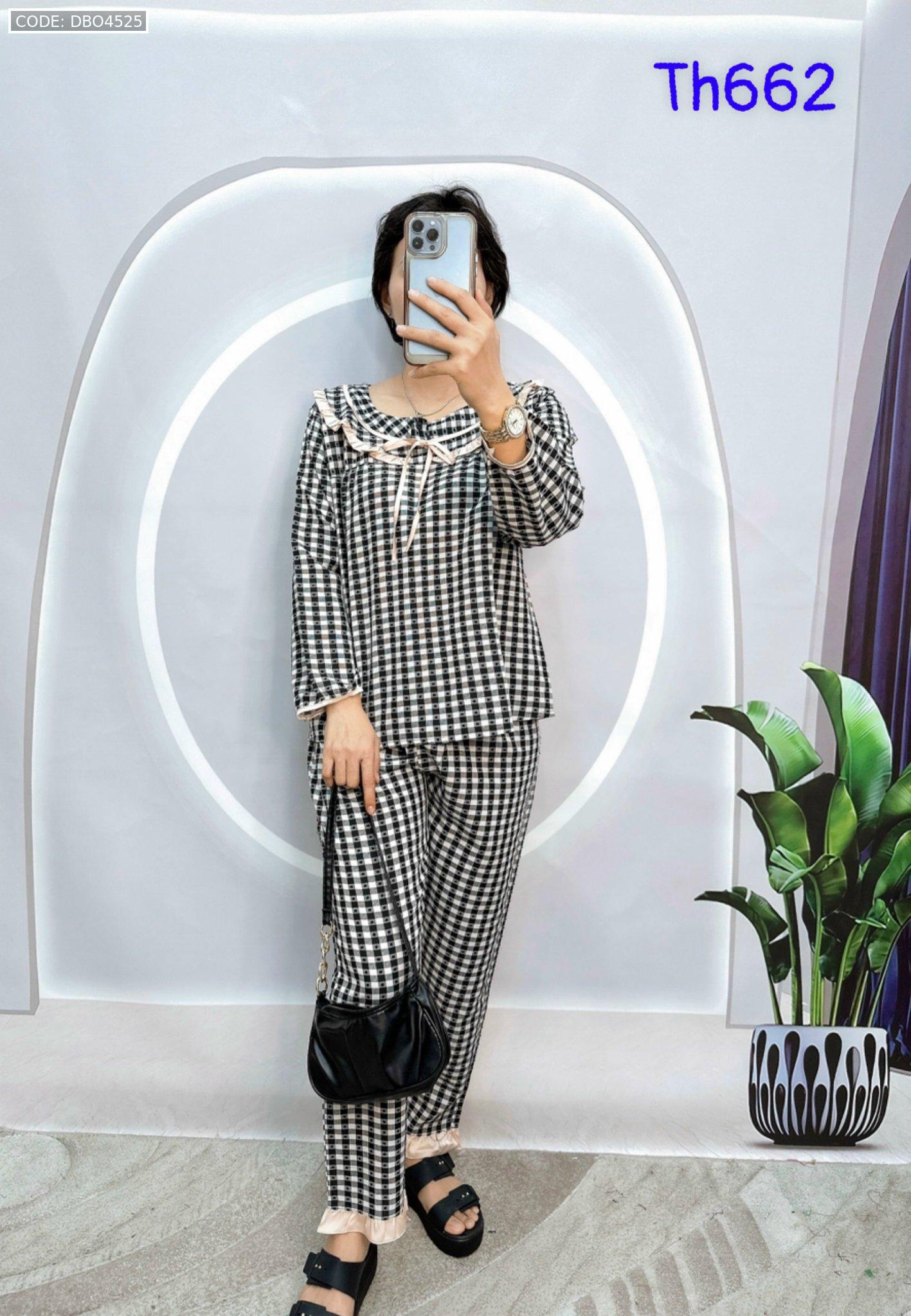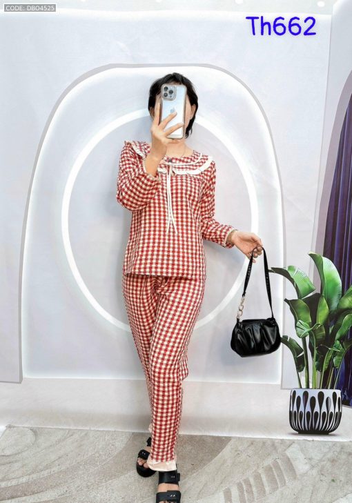 Shop sỉ đồ bộ caro mango quần dài áo tay dài bẻ có nơ