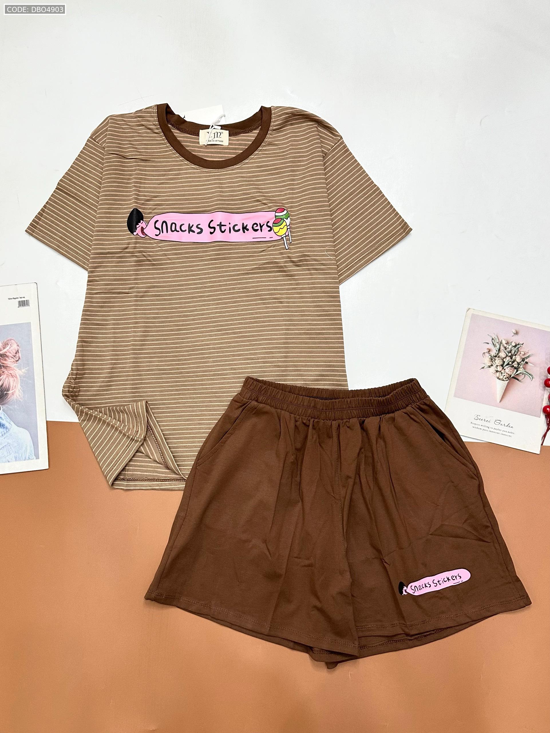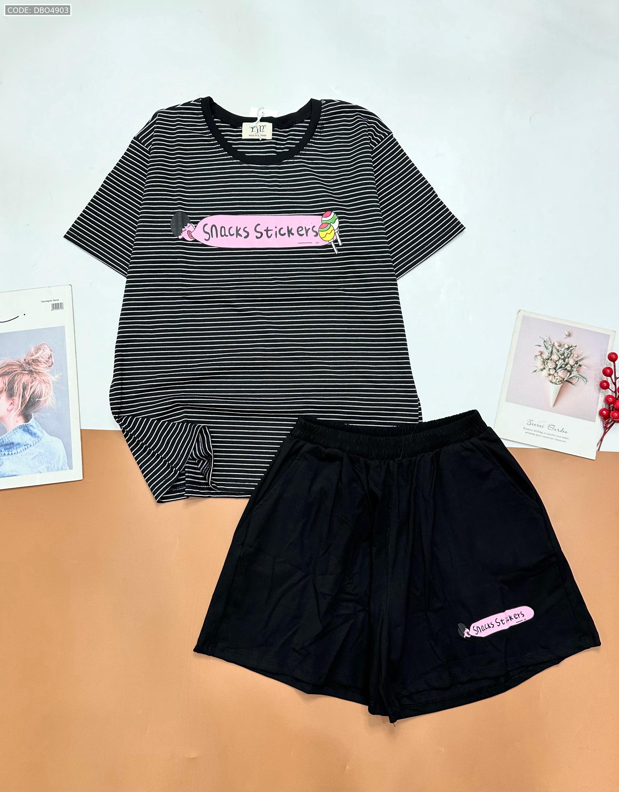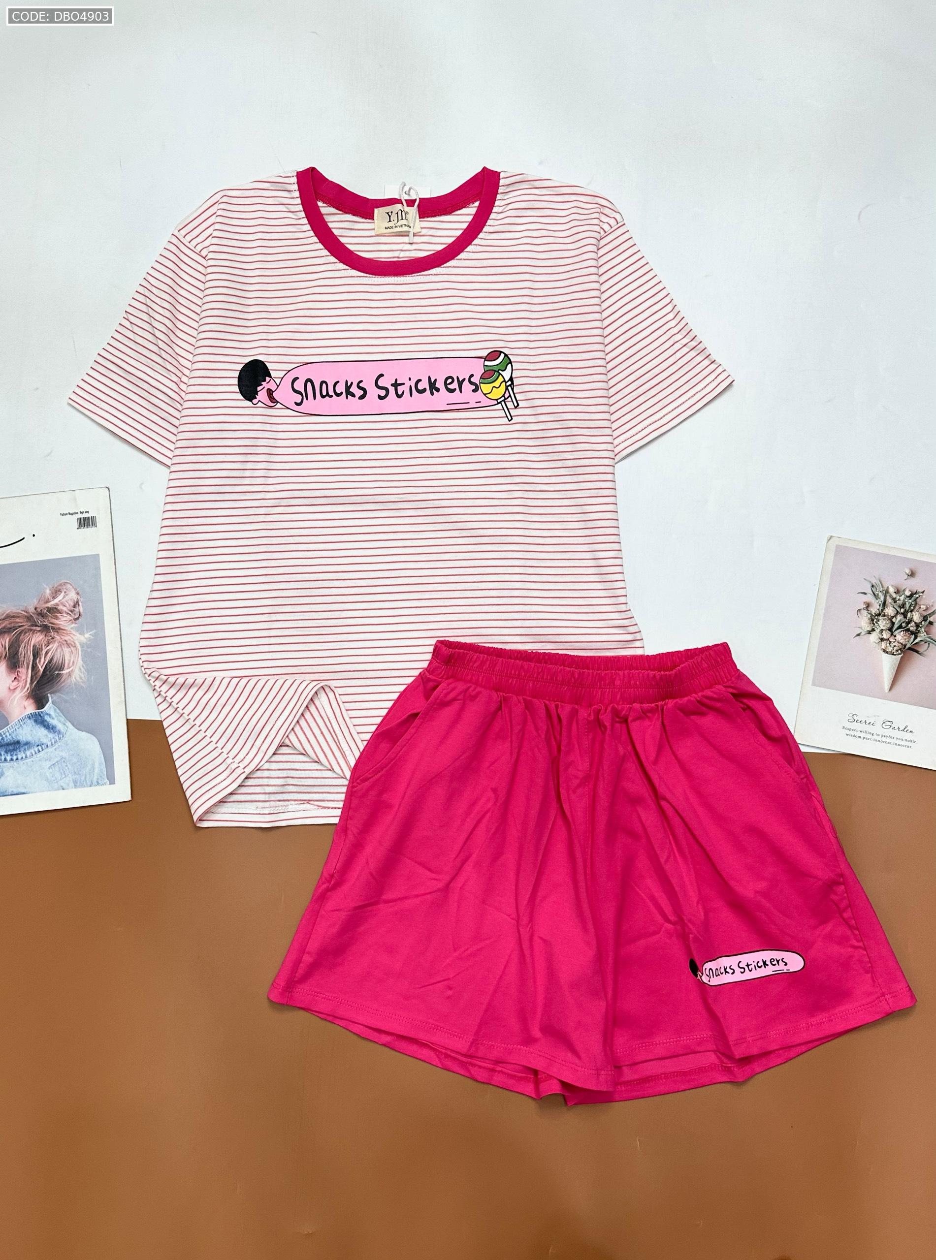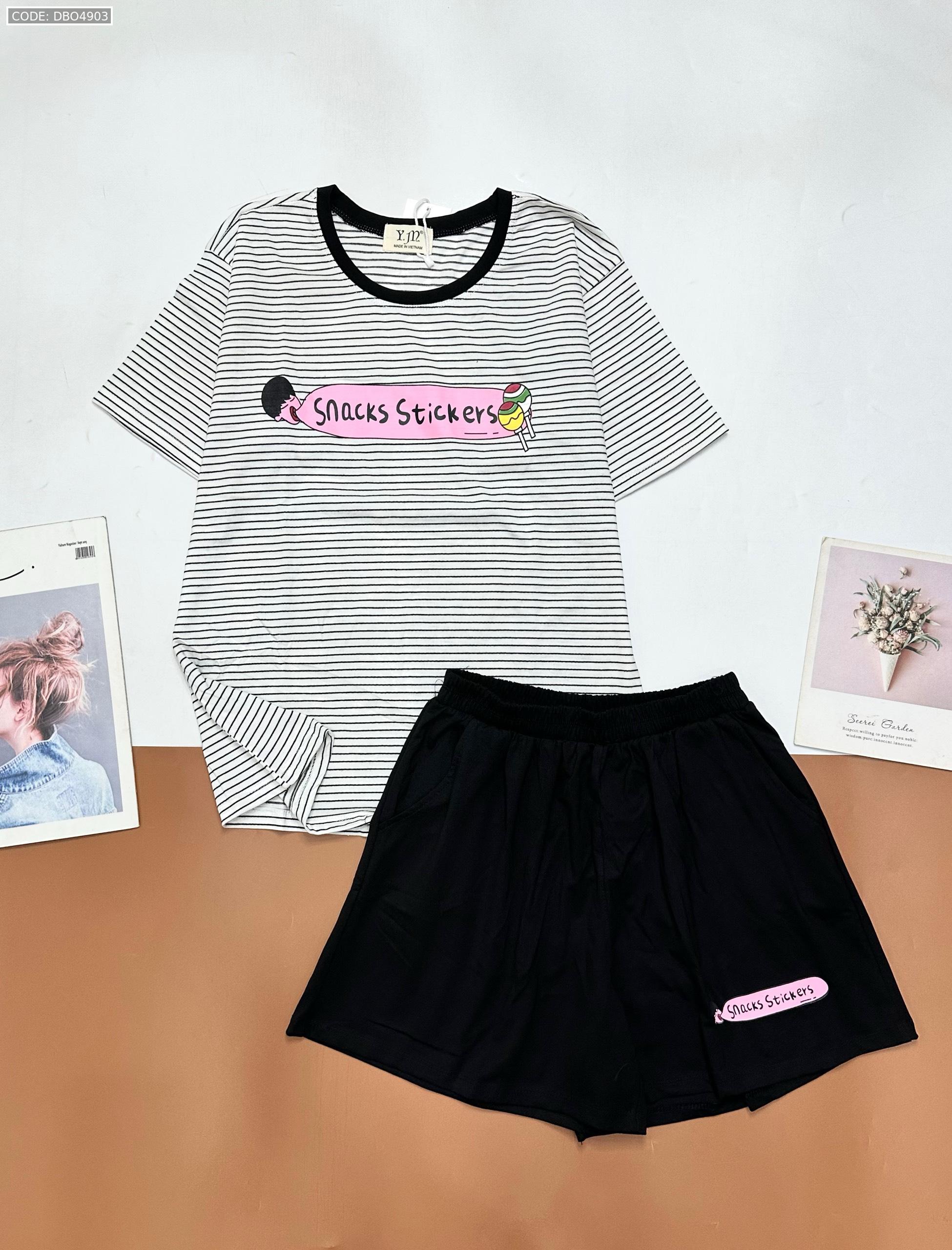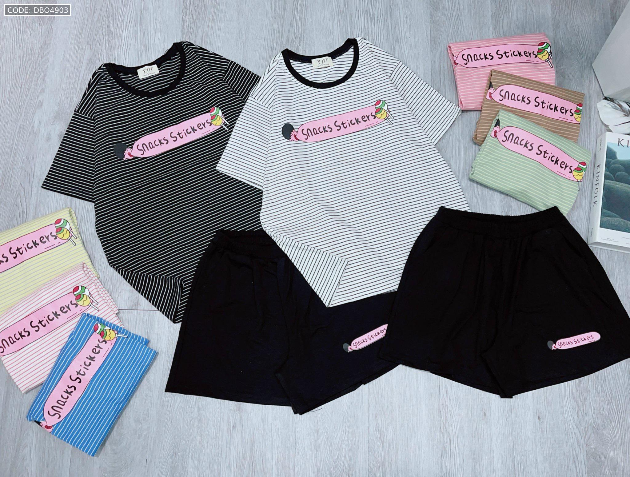 Shop sỉ đồ bộ quần đùi áo tay ngắn sọc ngang in chữ snacks