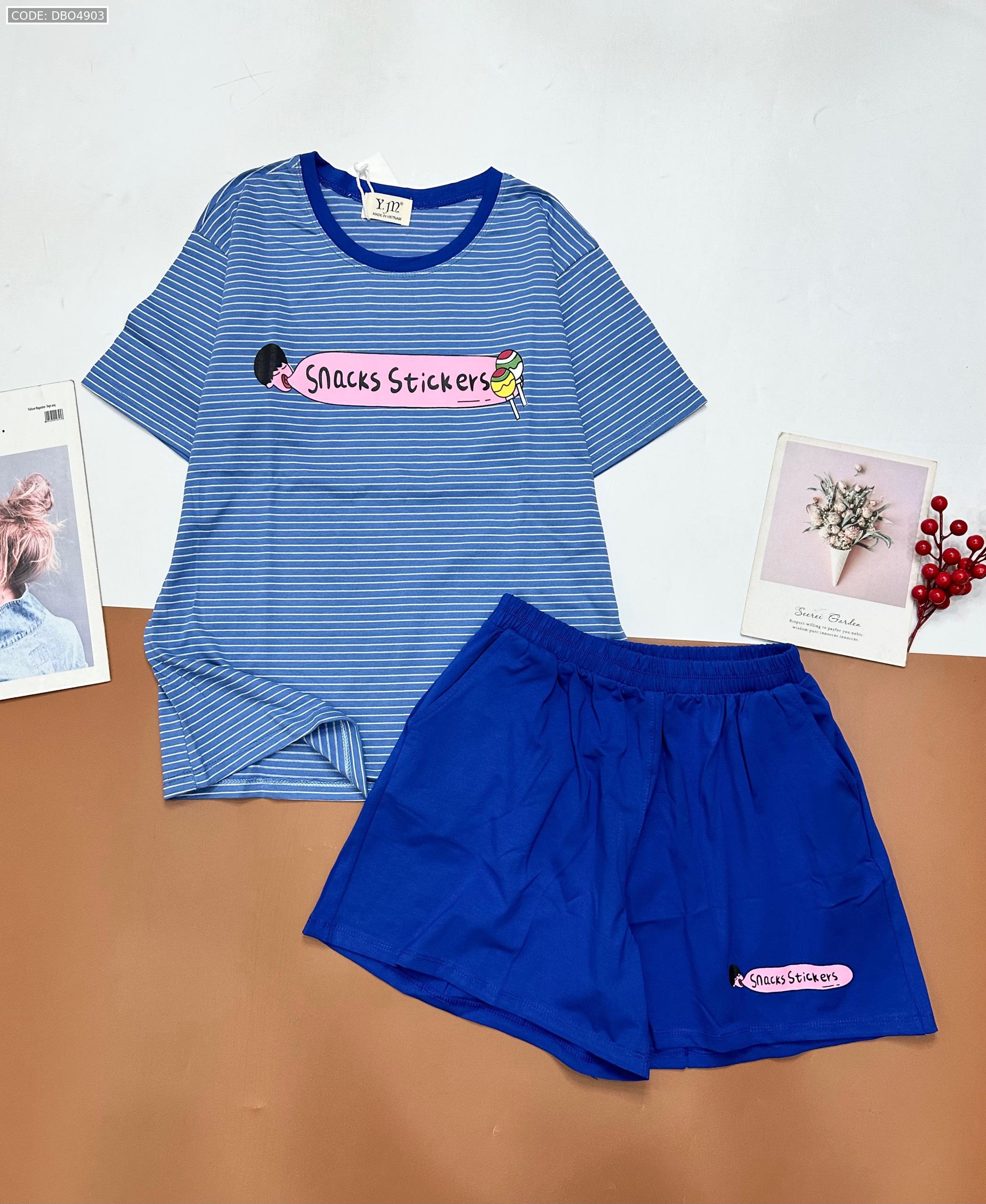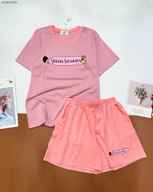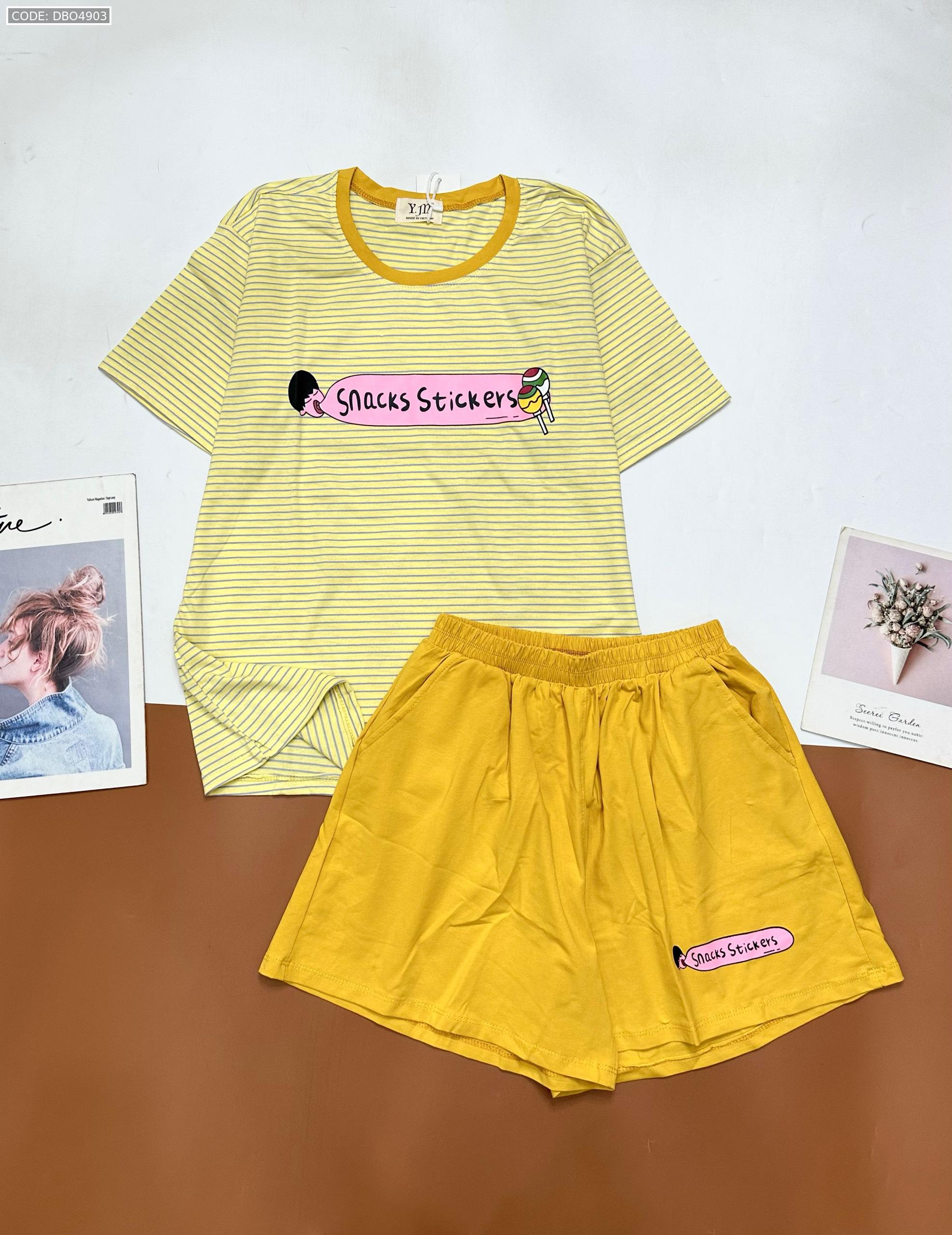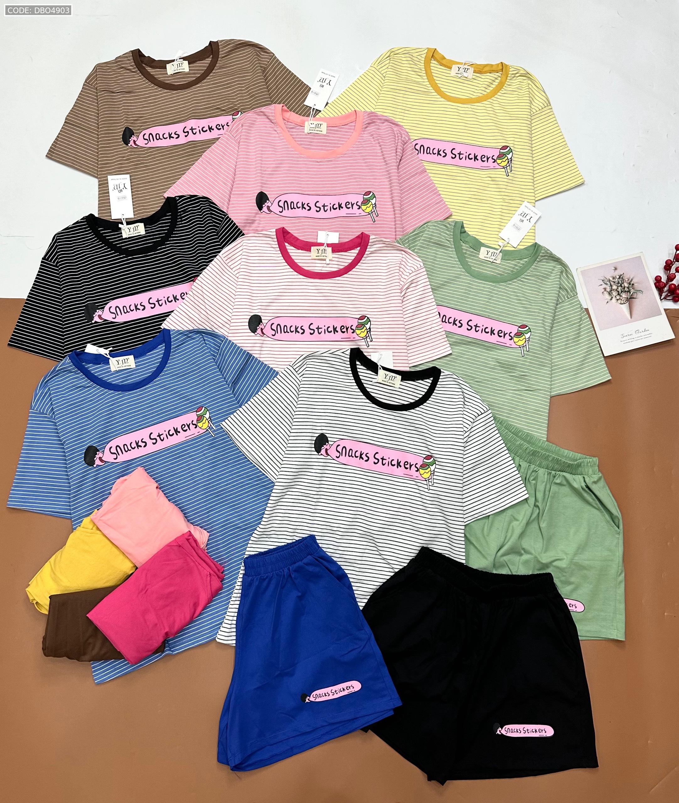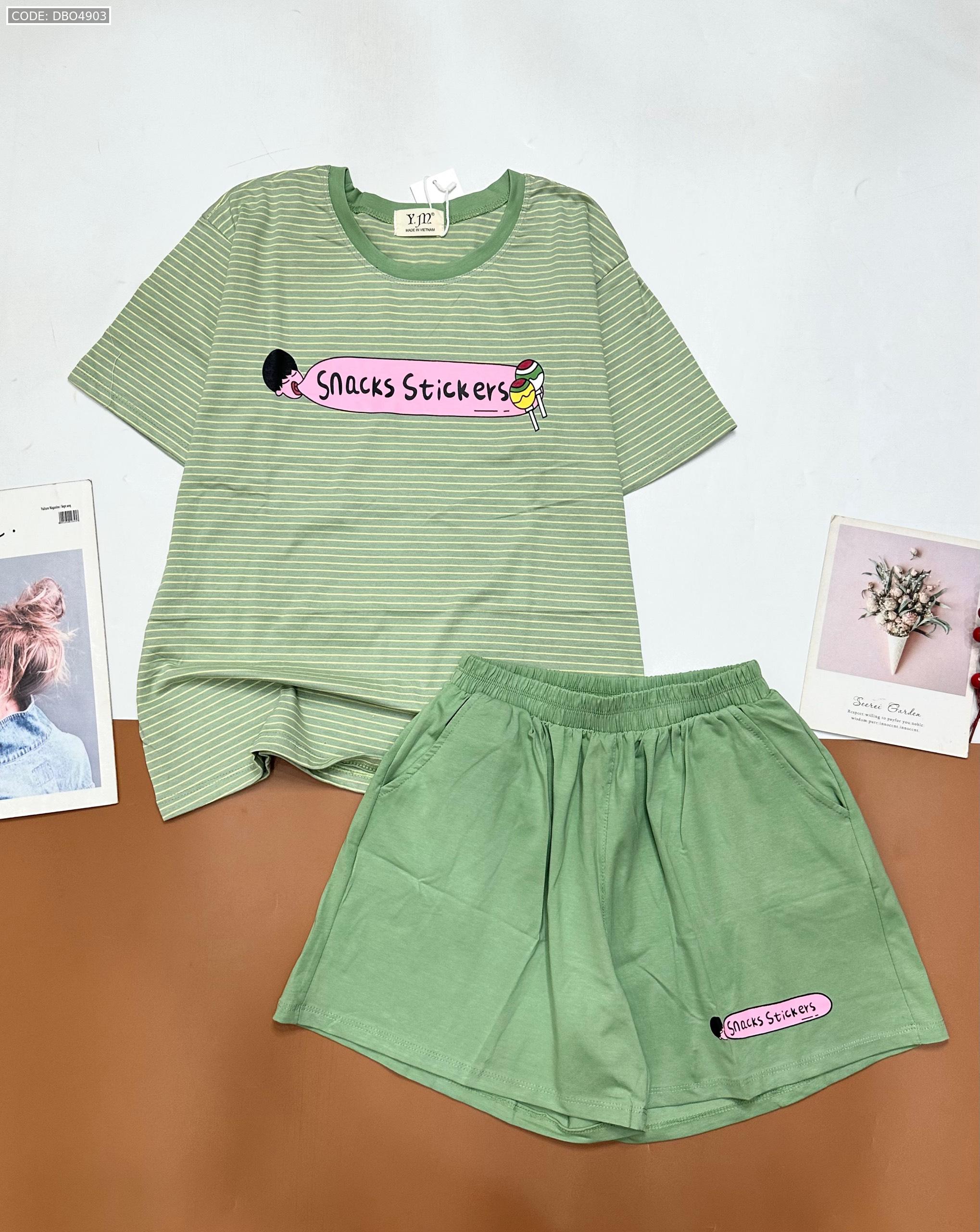 Shop sỉ đồ bộ quần đùi áo tay ngắn sọc ngang in chữ snacks