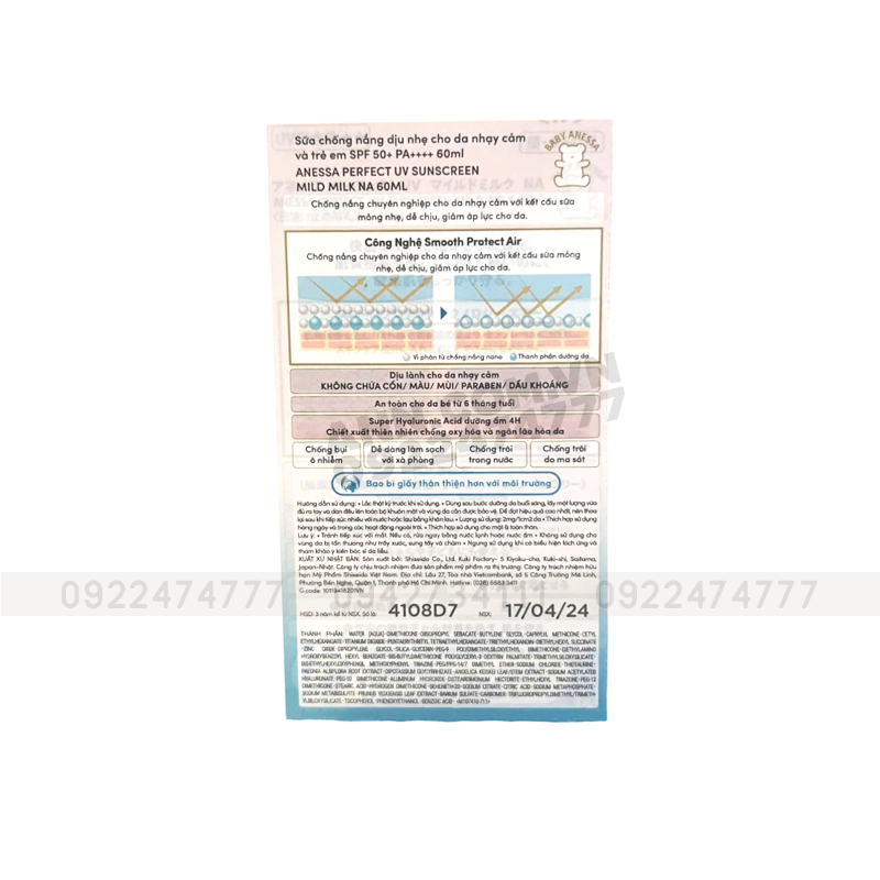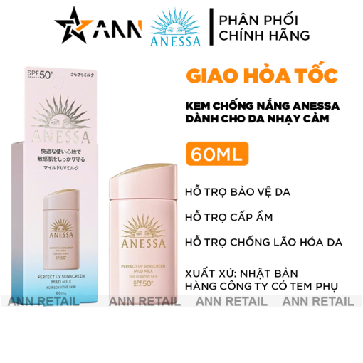 - Sữa chống nắng dịu nhẹ ANESSA Mild Milk SPF50+ PA++++ phiên bản mới với bao bì giấy thân thiện hơn với môi trường.