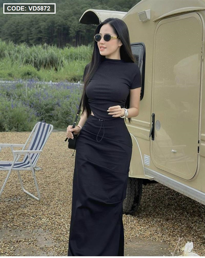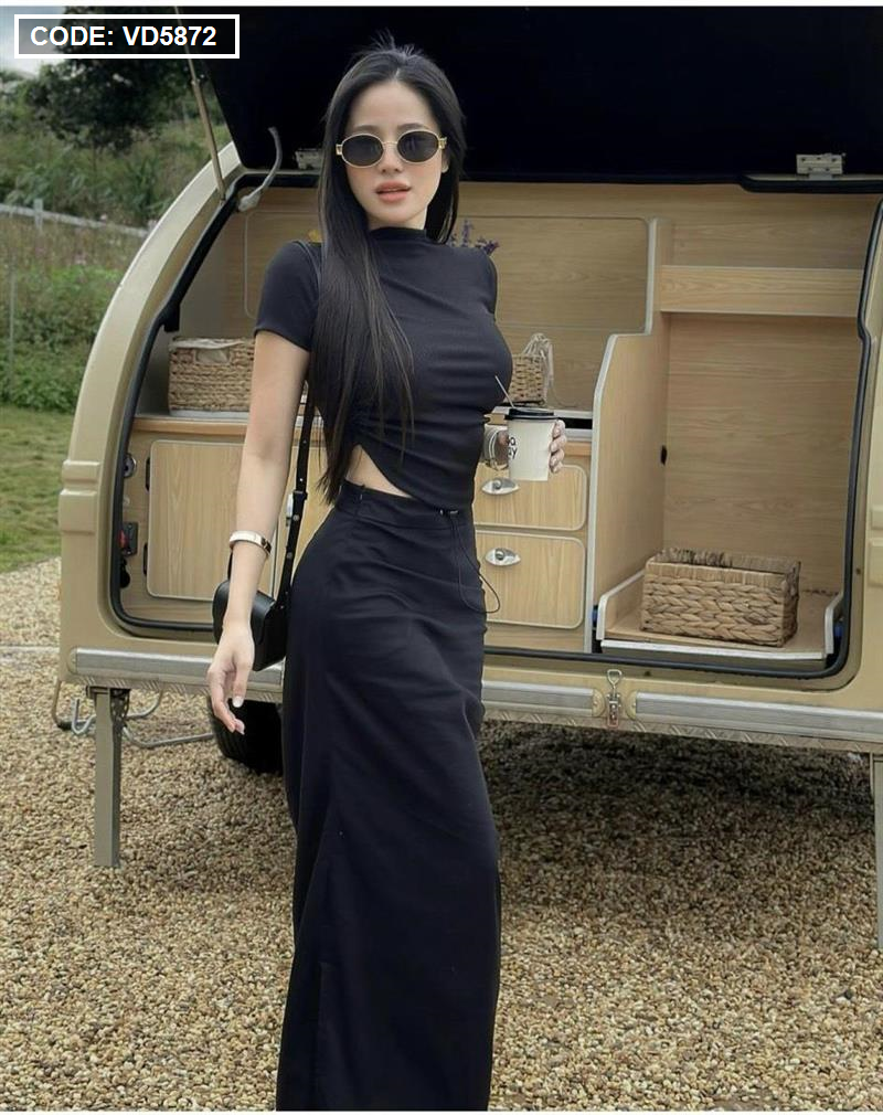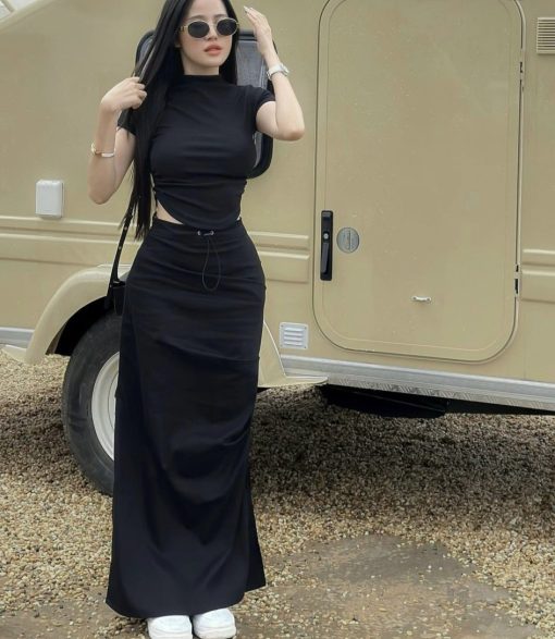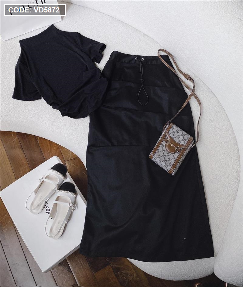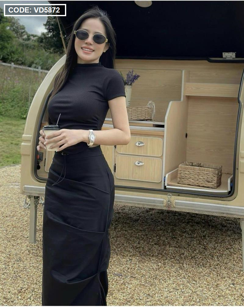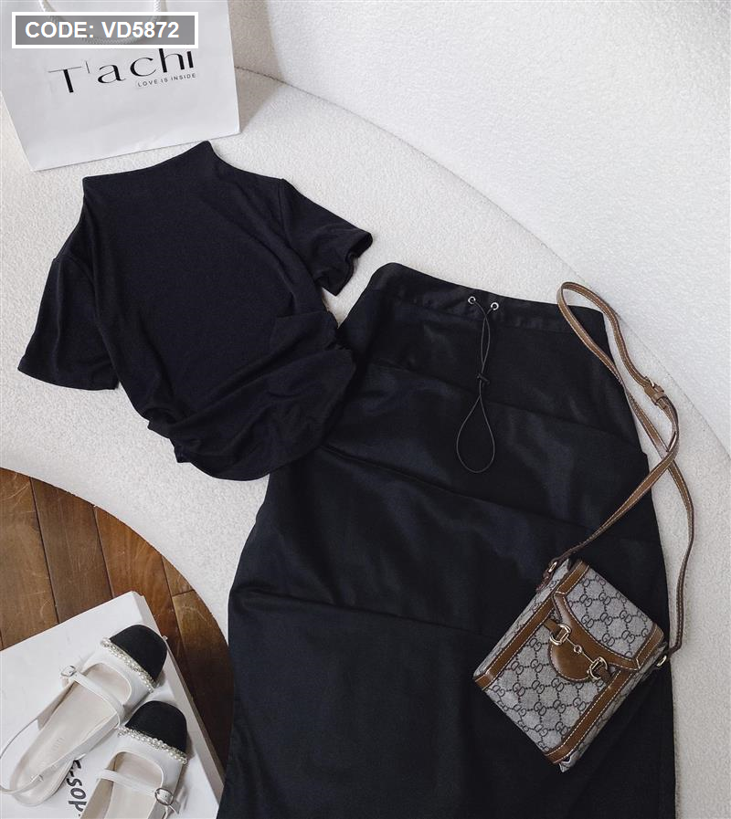 Shop sỉ sét áo đen cổ cao tà bàu + chân váy midi