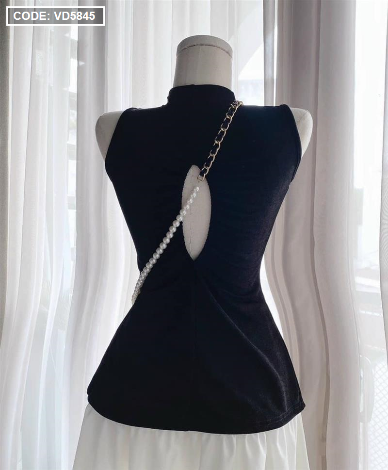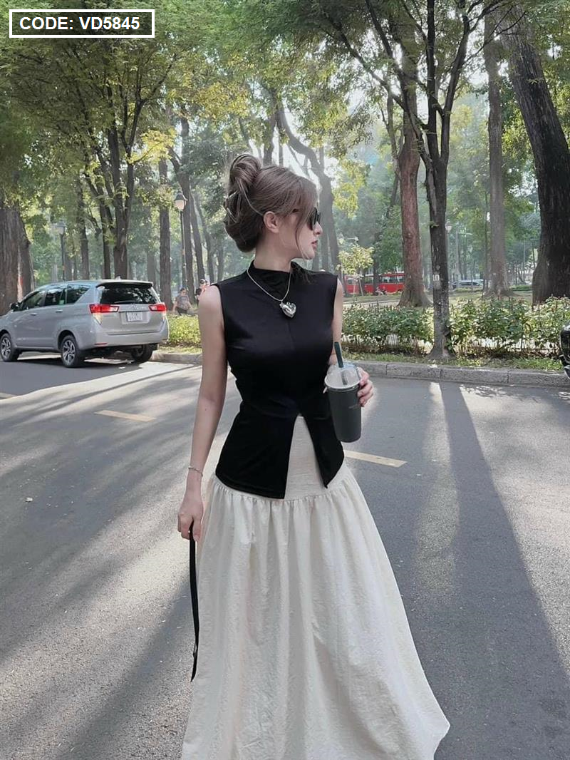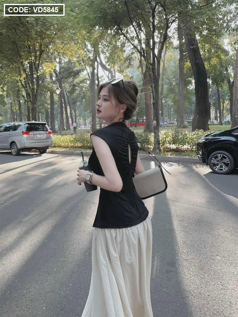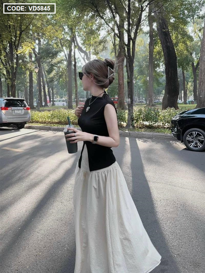 Shop sỉ sét áo đen xẻ tà khoét lưng + chân váy midi xoè