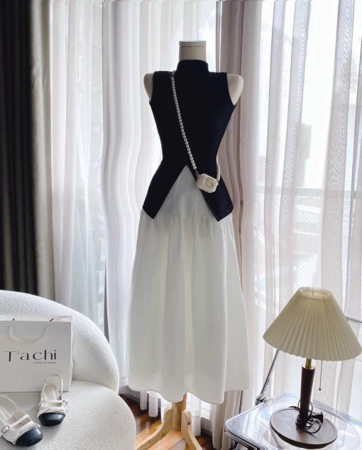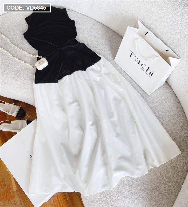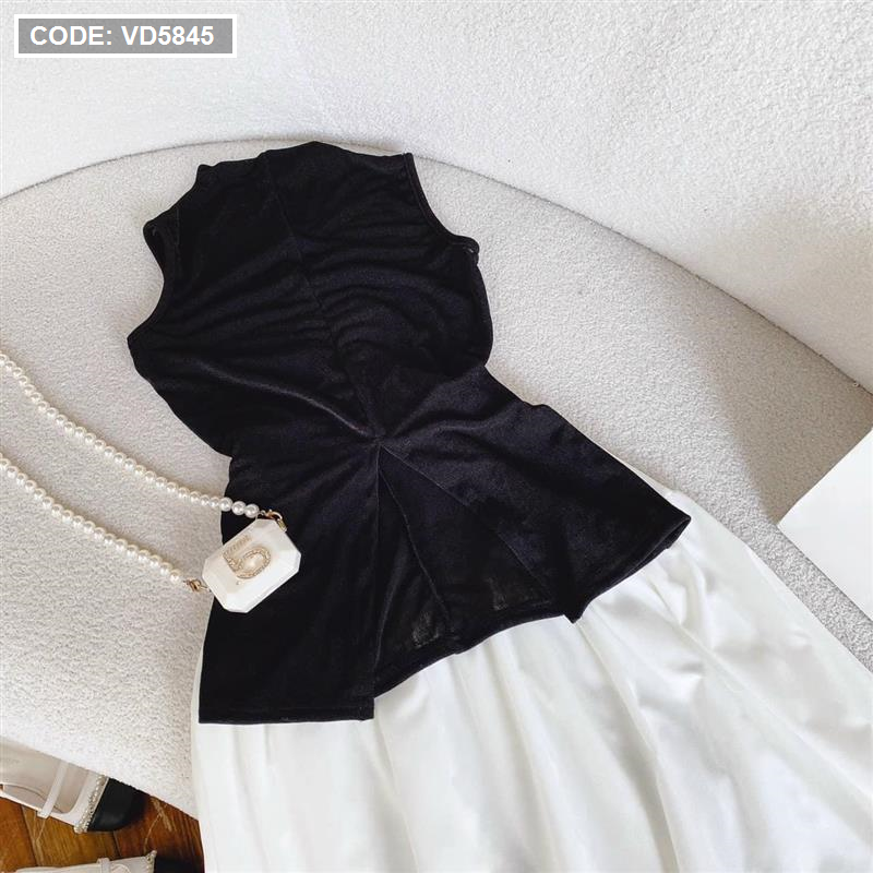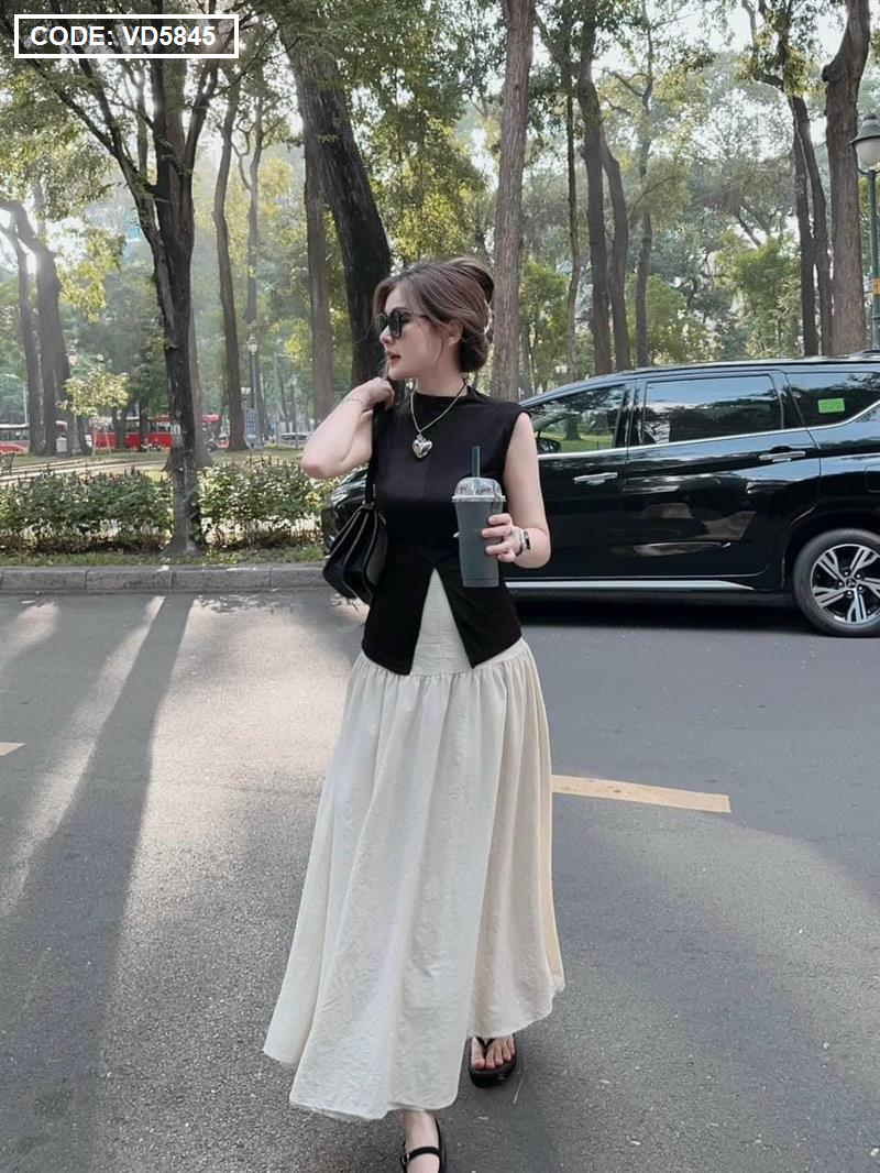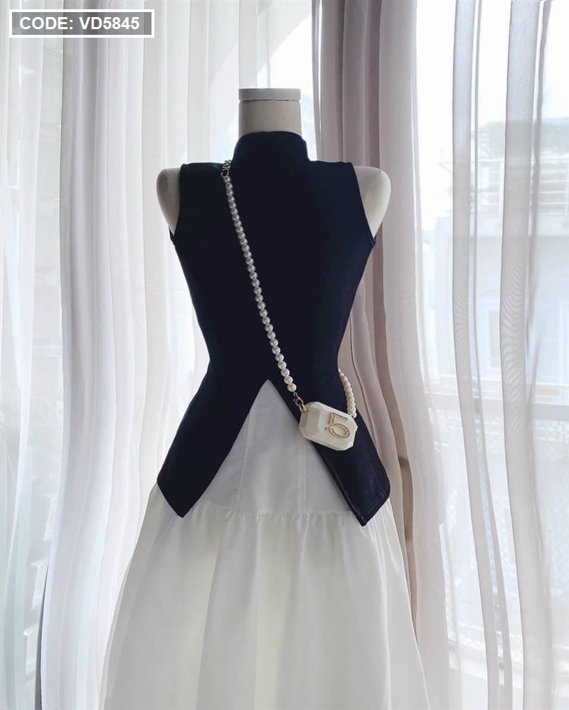 Shop sỉ sét áo đen xẻ tà khoét lưng + chân váy midi xoè