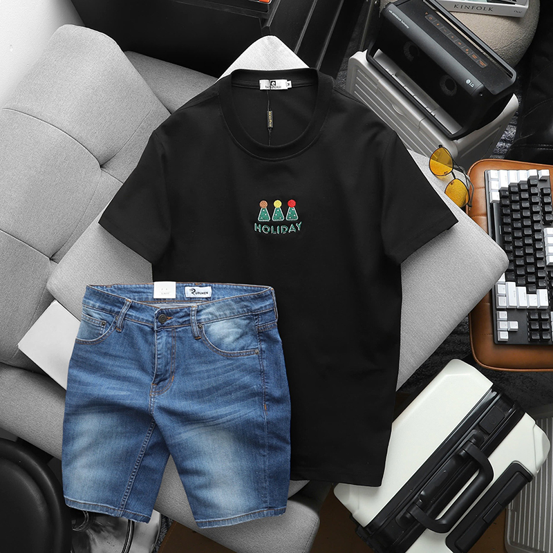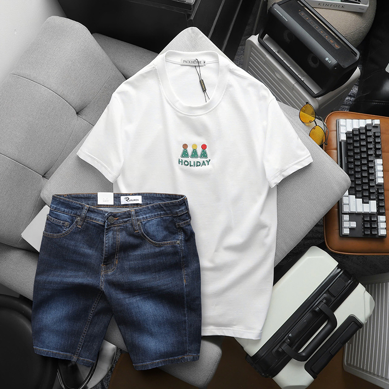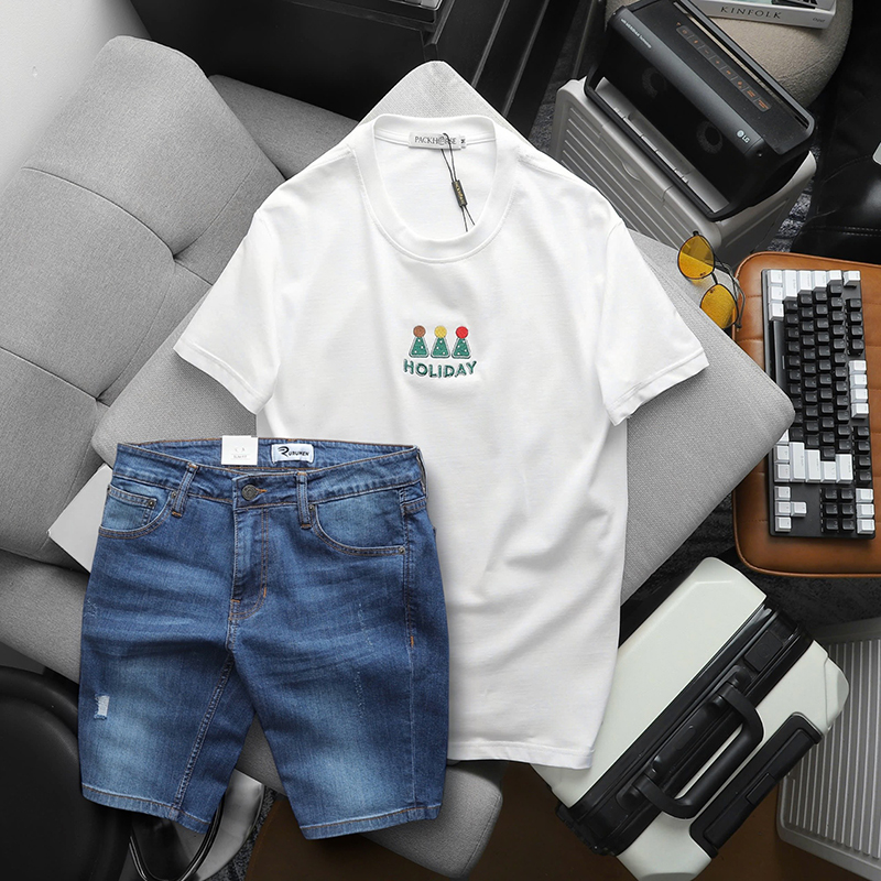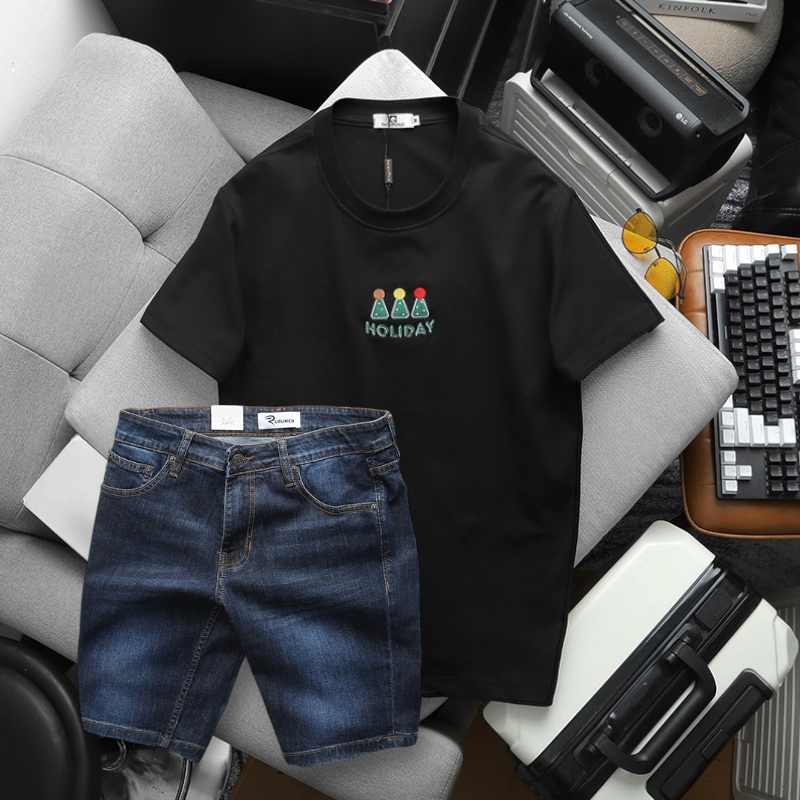Shop sỉ set Bộ Nam Áo Thun Cổ Tròn In Nổi Chữ Holiday + Quần Short Jeans Chất Liệu Co Giãn (Có Size 3X)