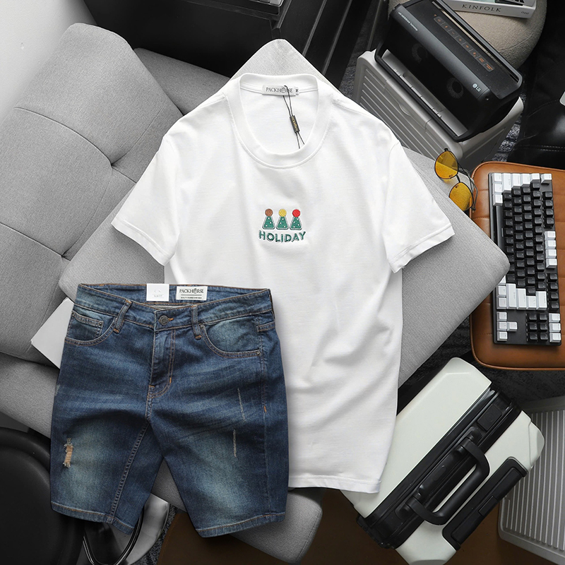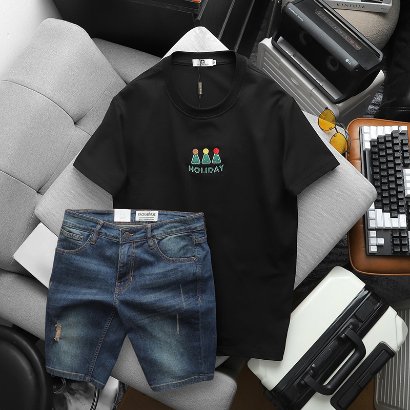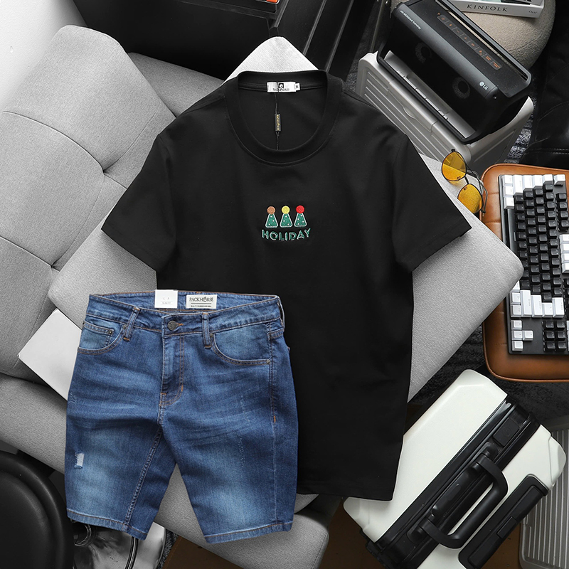Set bộ nam gồm áo thun cổ tròn in chữ Holiday kèm quần short jeans chất liệu co giãn, phù hợp cho các hoạt động thường ngày hay dạo phố.