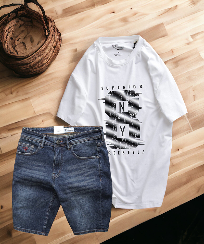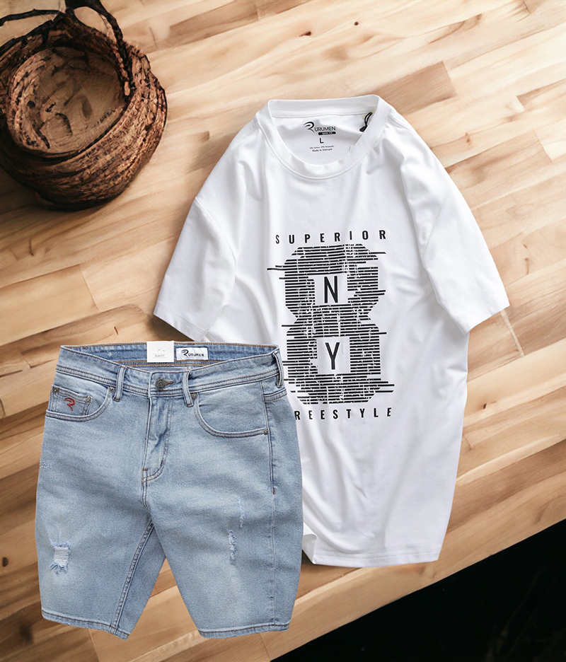 Shop sỉ set Bộ Nam Quần Short Jeans Phối Áo Thun Cotton Cổ Tròn In Chữ