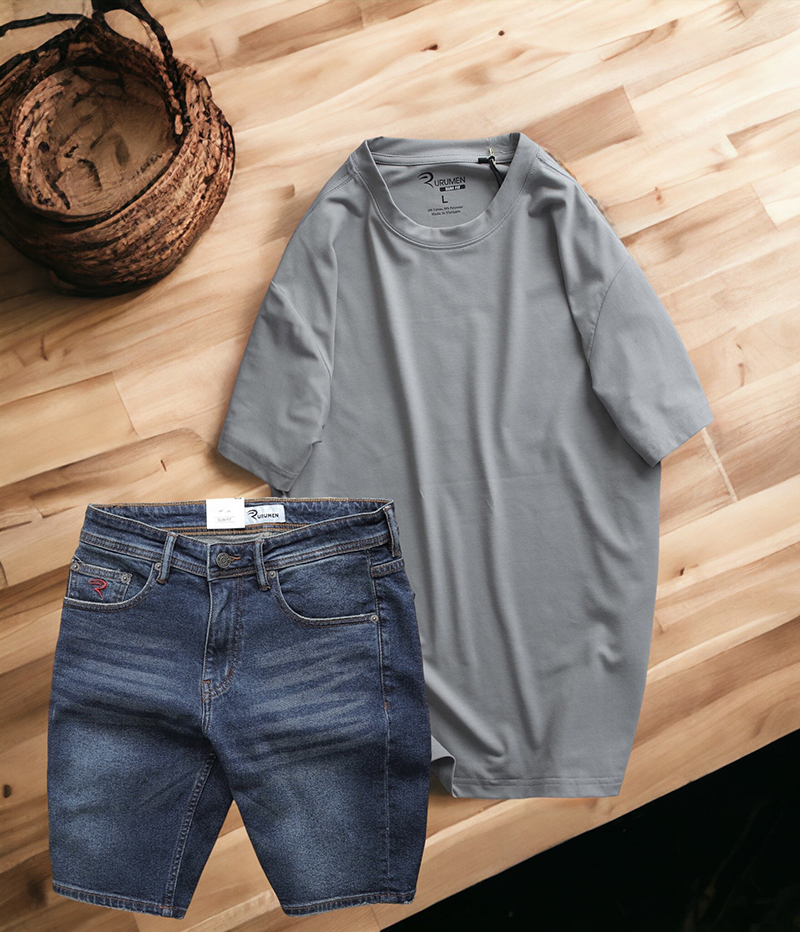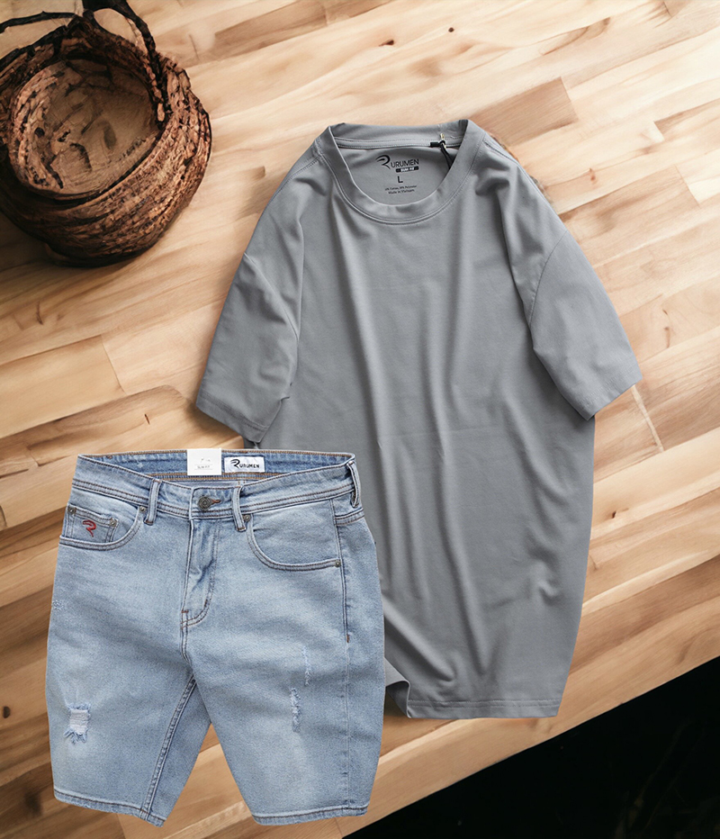 Set Bộ Nam Quần Short Jeans Phối Áo Thun Cotton Cổ Tròn In Chữ