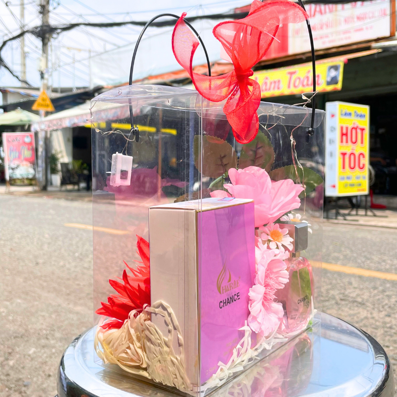 Set quà Charme Chance 50ml được thiết kế trong hộp trong suốt sang trọng, kết hợp hoa trang trí cùng ánh đèn đom đóm lung linh, tạo nên một món quà tinh tế và nổi bật – rất phù hợp để dành tặng phái đẹp trong những dịp đặc biệt.