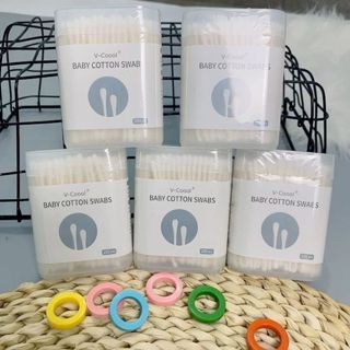 Hộp 200 Tăm Bông Ngoáy Tai – Tăm Bông Vcool 2 Đầu Tròn Và Dẹt Cho Bé Sơ Sinh 8x6x3.5cm