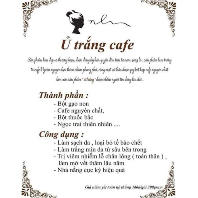 – Ủ Trắng da Cafe chính hãng giúp làn da trắng sáng tự nhiên, sản phẩm có nguồn gốc từ thiên nhiên. Là một sản phẩm đem lại giải pháp làm đẹp quen thuộc của các chị em phụ nữ hiện nay. Với nhiều thành phần từ thảo dược, cung cấp nhiều dưỡng chất cho làn da trắng hồng và khỏe mạnh. Sản phẩm này hiệu quả cao an toàn khi sử dụng, không có chất tẩy da, không bắt nắng khi sử dụng. Là liệu pháp làm đẹp an toàn mà nàng nào cũng nên thử một lần trong đời.